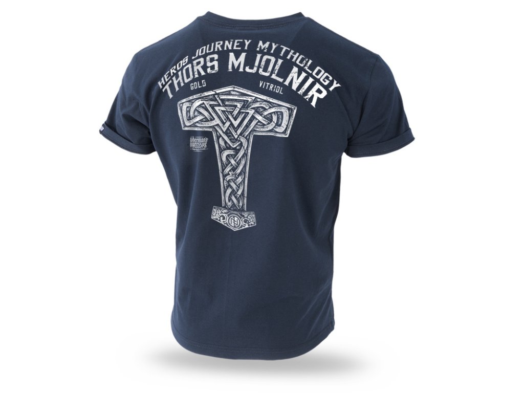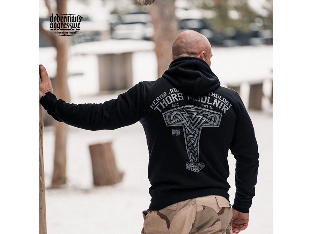 Na levém rukávu je všitá malá cedulka s logem značky. Na zádech je vzor, který zobrazuje Thorovo kladivo s nápisem HEROS JOURNEY MYTHOLOGY THORS MJOLNIR a logo Doberman’s Aggressive. Na levé straně hrudi je miniatura vzoru Thorova kladiva.