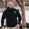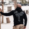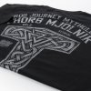 Na levém rukávu je všitá malá cedulka s logem značky. Na zádech je vzor, který zobrazuje Thorovo kladivo s nápisem HEROS JOURNEY MYTHOLOGY THORS MJOLNIR a logo Doberman’s Aggressive. Na levé straně hrudi je miniatura vzoru Thorova kladiva.