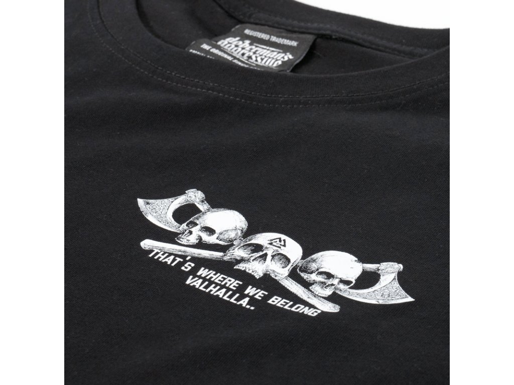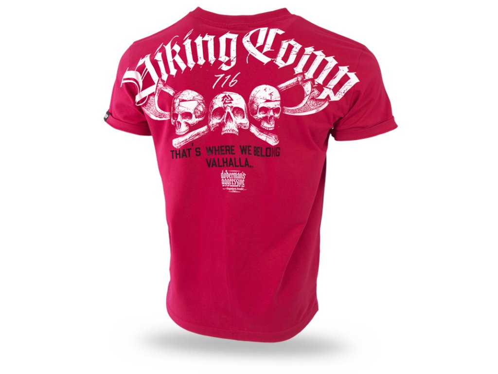 Na levém rukávu je všitá malá cedulka s logem značky. Na zádech je dvojbarevný vzor s nápisem Viking Comp, třema lebkami a sekerami a nápisem „That’s where we belong Valhalla”. Vpředu na levé straně hrudi je miniatura vzoru, který se nachází na zadní straně trička.