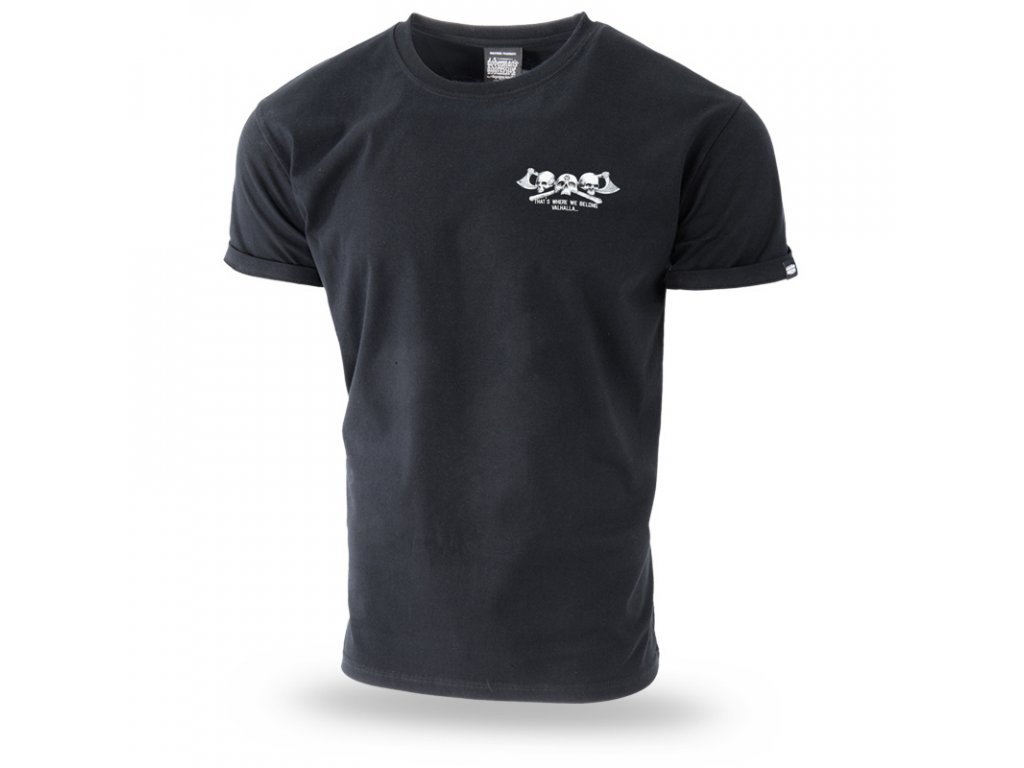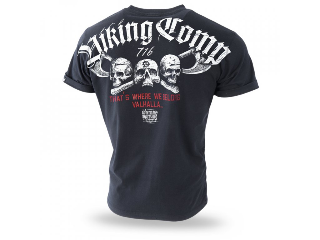Na levém rukávu je všitá malá cedulka s logem značky. Na zádech je dvojbarevný vzor s nápisem Viking Comp, třema lebkami a sekerami a nápisem „That’s where we belong Valhalla”. Vpředu na levé straně hrudi je miniatura vzoru, který se nachází na zadní straně trička.