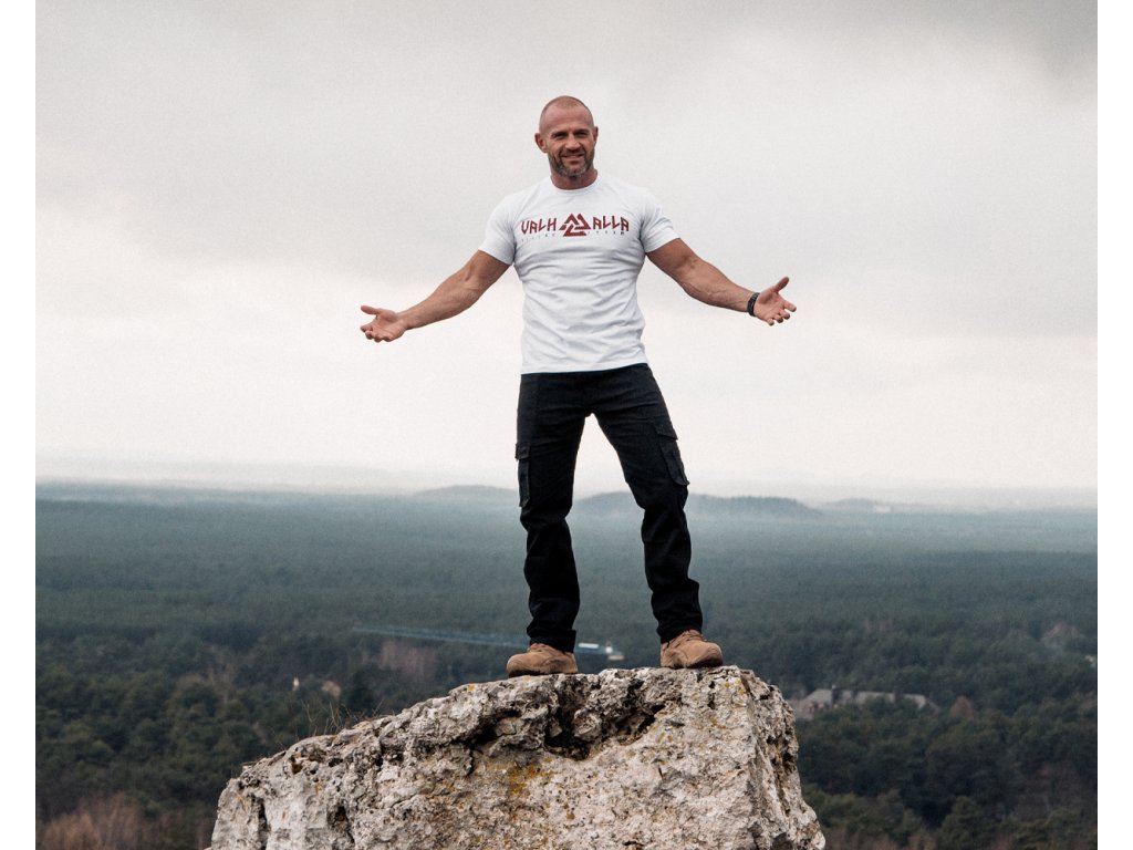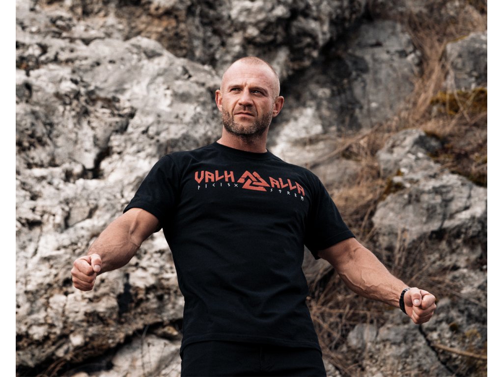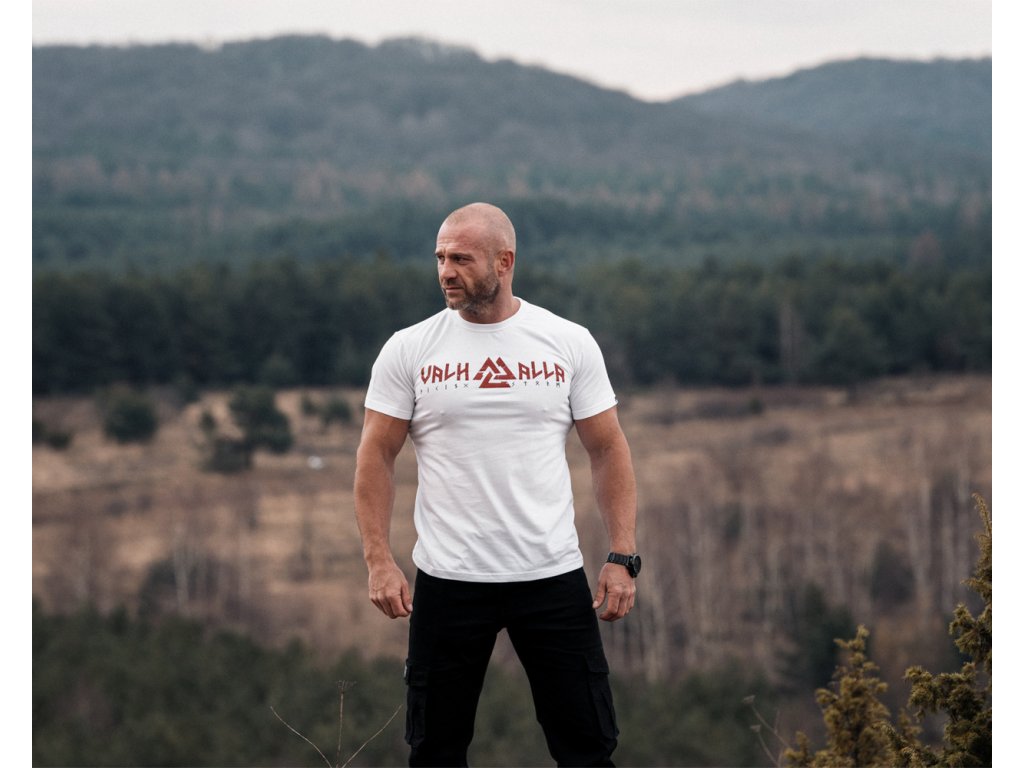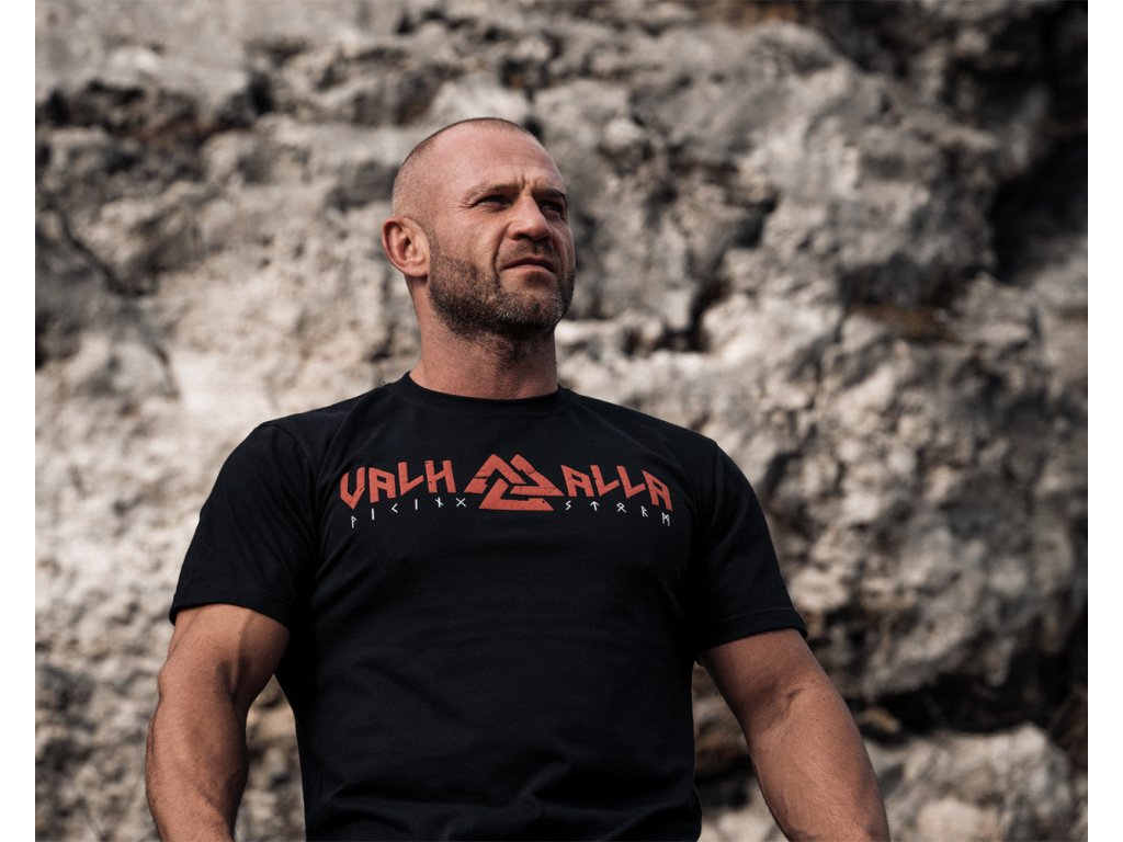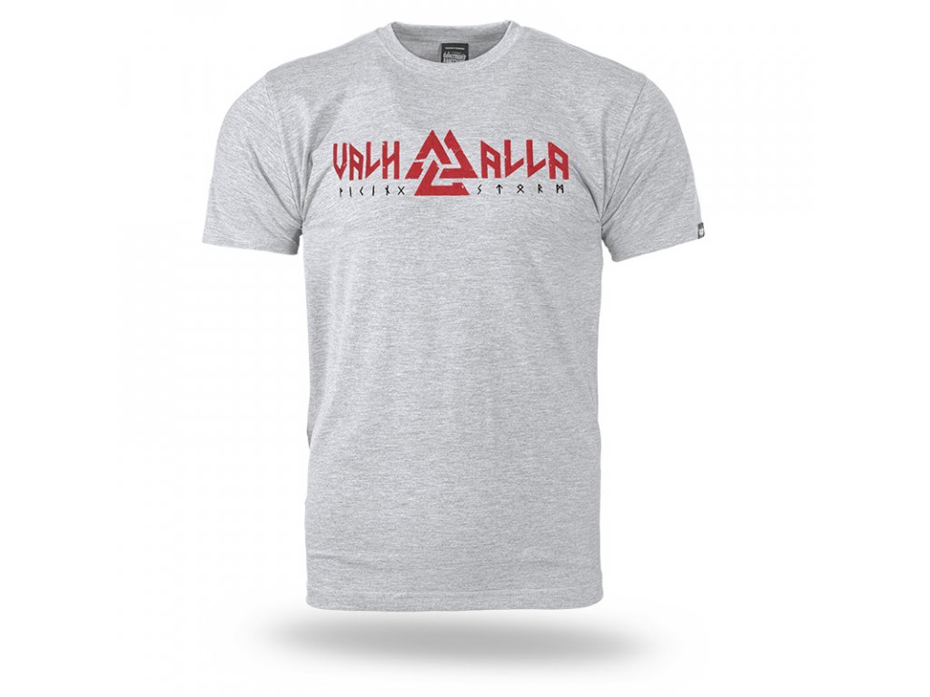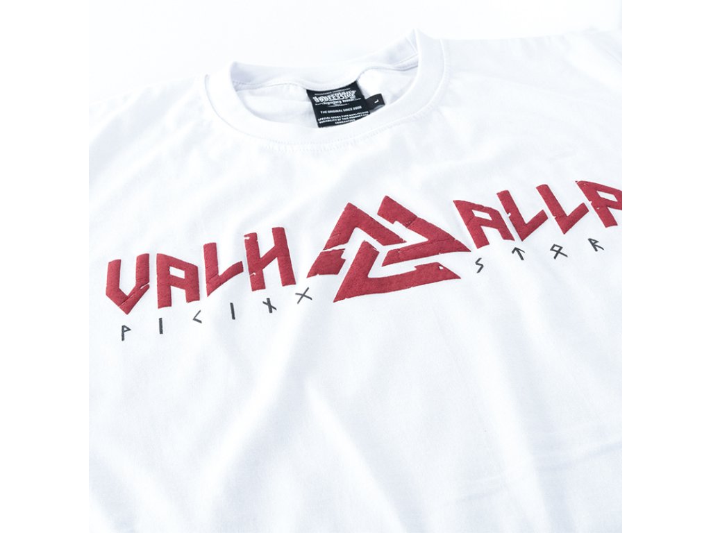 Oblečení je vyrobeno z bavlny o hmotnosti 200g. Na levém rukávu je malá cedulka s logem Doberman’s Aggressive. Na přední straně tílka se nachází nápis Valhalla vytvořený vypouklým potiskem. Vzor doplňuje severský symbol.
