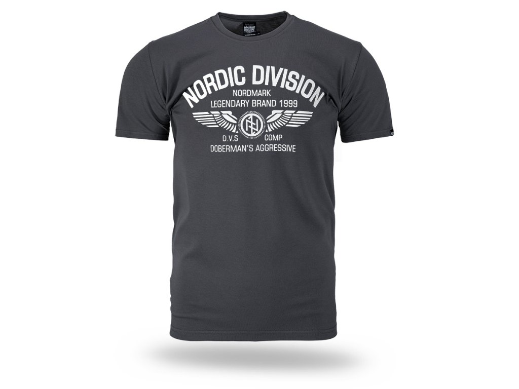 Model vyrobený v pohodlném klasickém střihu, který zajišťuje komfort při každodenním nošení. Na přední straně se nachází velký potisk s nápisem „Nordic Division – Nordmark Legendary Brand 1999“, doplněný grafickým motivem křídel a emblémem značky. Design je inspirován severskou a vojenskou estetikou a zdůrazňuje charakteristický a rozpoznatelný styl značky. Tričko má kulatý výstřih zakončený elastickým nápletem a klasické rukávy, díky čemuž se dobře přizpůsobí postavě a hodí se pro každodenní nošení.