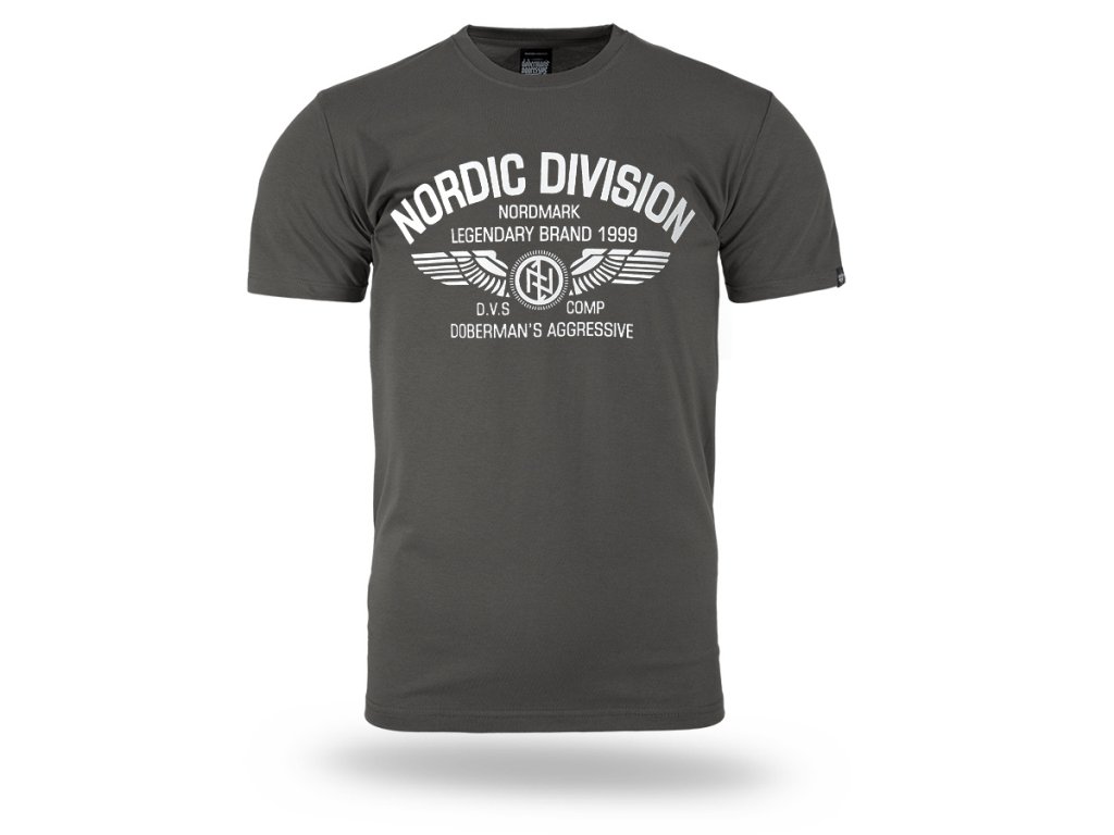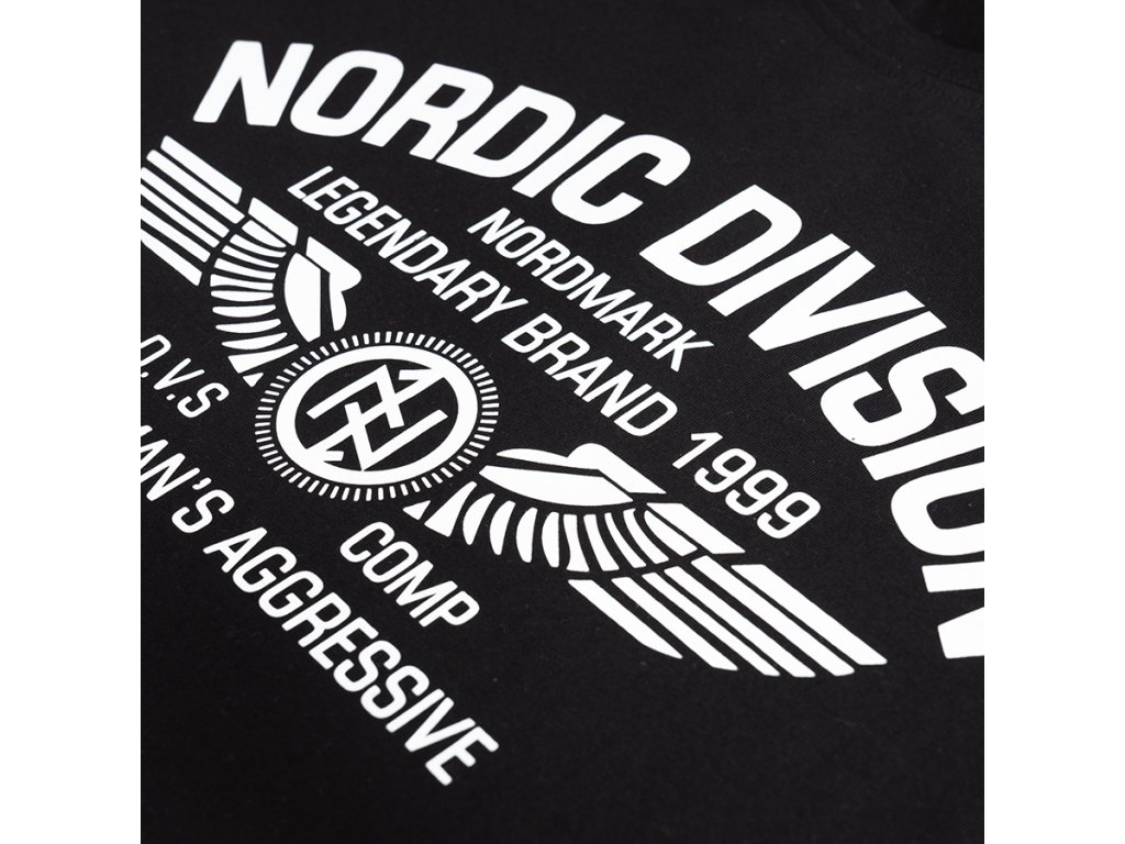 Model vyrobený v pohodlném klasickém střihu, který zajišťuje komfort při každodenním nošení. Na přední straně se nachází velký potisk s nápisem „Nordic Division – Nordmark Legendary Brand 1999“, doplněný grafickým motivem křídel a emblémem značky. Design je inspirován severskou a vojenskou estetikou a zdůrazňuje charakteristický a rozpoznatelný styl značky. Tričko má kulatý výstřih zakončený elastickým nápletem a klasické rukávy, díky čemuž se dobře přizpůsobí postavě a hodí se pro každodenní nošení.