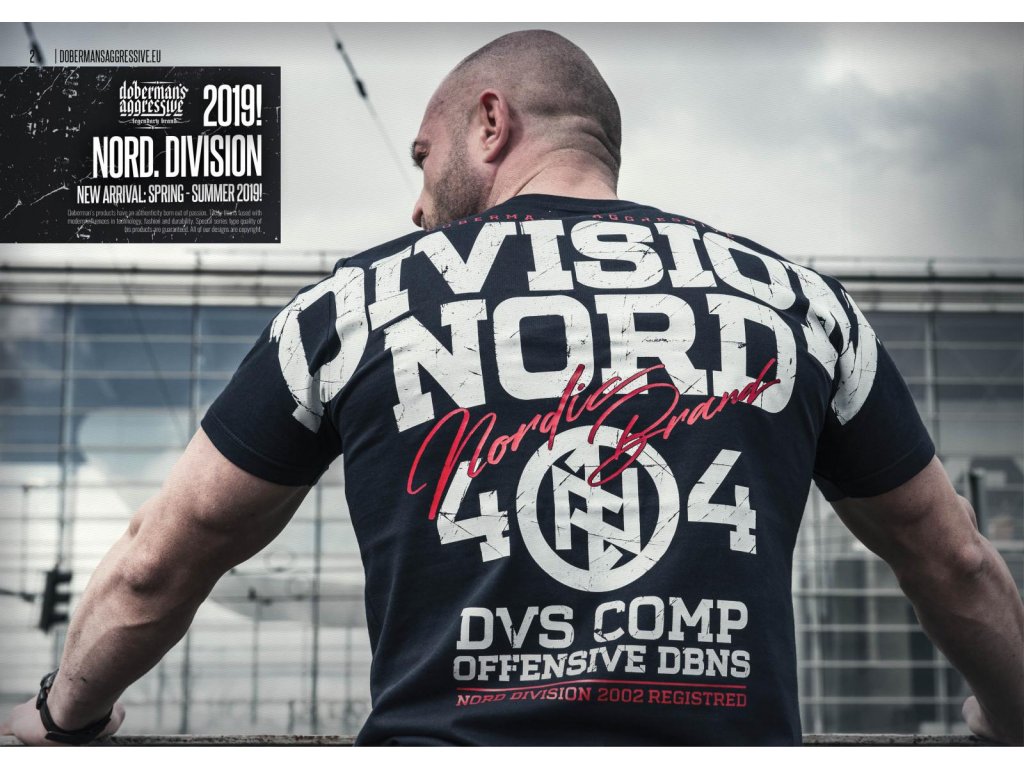 Úzký stahovací lem u krku a malá cedulka s logem Dobermans Aggressive na levém rukávu. Uvnitř je tkaná cedulka. Na zádech je velký vzor složený z nápisů, použitý efekt poničení potisku. Nápis Division přechází přes švy obou rukávů. Níže je velké číslo 404 a ozdobný text Nordic Brand. Vzor ve dvou barvách. Na přední straně je nevelký potisk na levé straně hrudi.