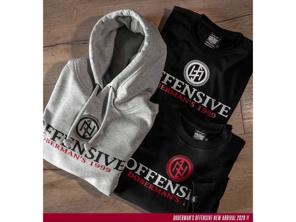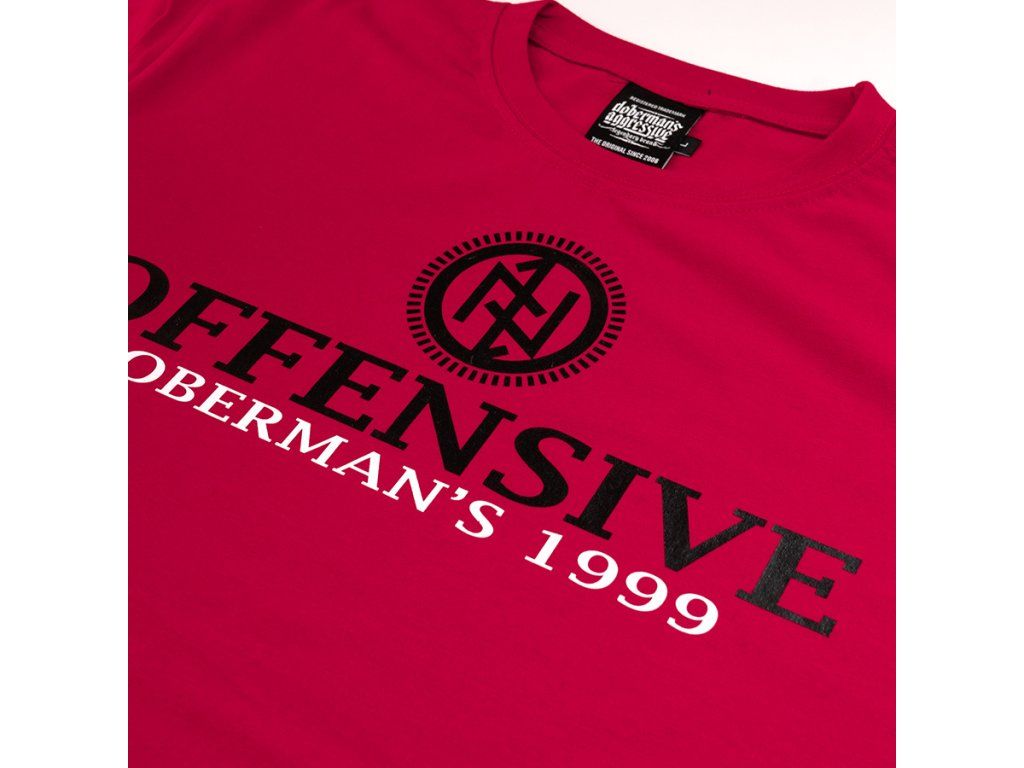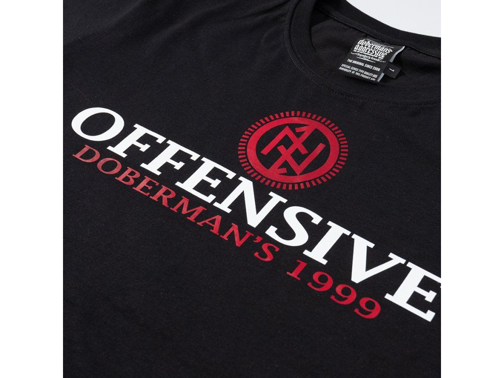 Model s kulatým výstřihem zakončeným žebrovaným lemem a krátkými rukávy, který zajišťuje pohodlí při každodenním nošení. Na přední straně se nachází výrazný potisk s velkým nápisem „OFFENSIVE“, doplněný sloganem „Doberman’s 1999“ a charakteristickým symbolem značky umístěným nad typografií. Zadní strana trička je hladká, což podtrhuje minimalistický charakter střihu a zvýrazňuje výrazný sportovně-streetový akcent na přední straně.