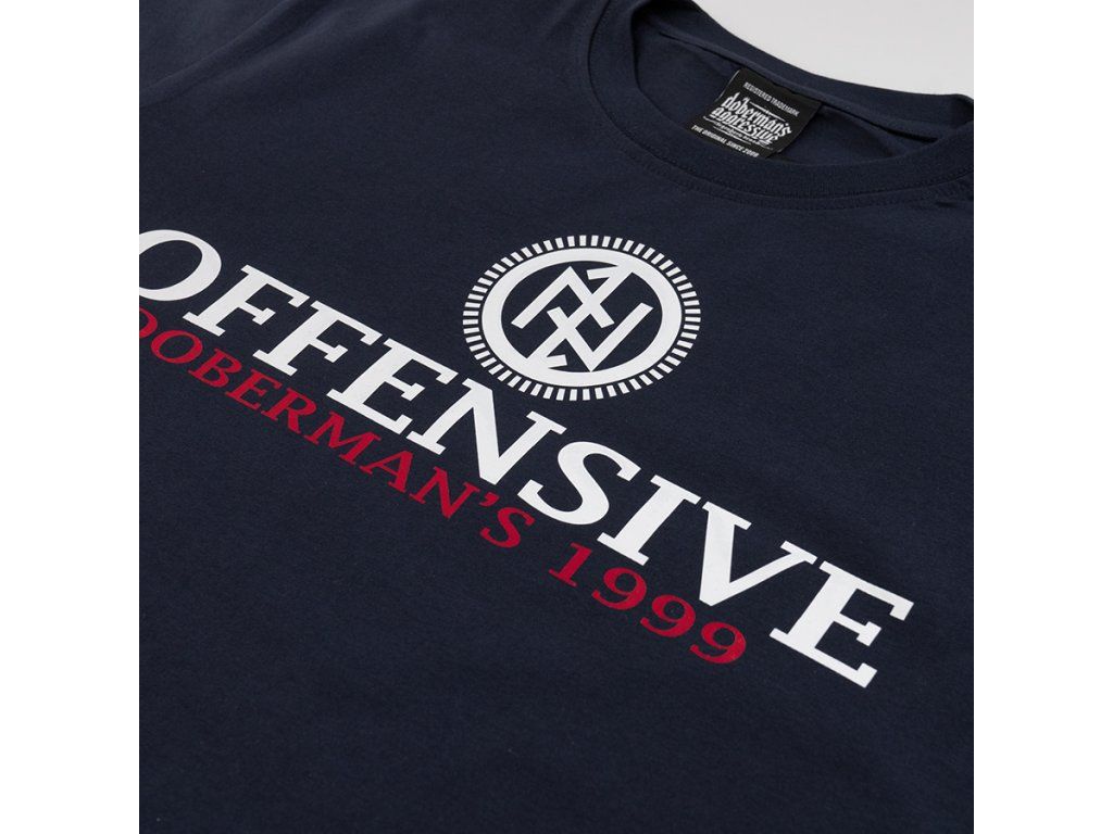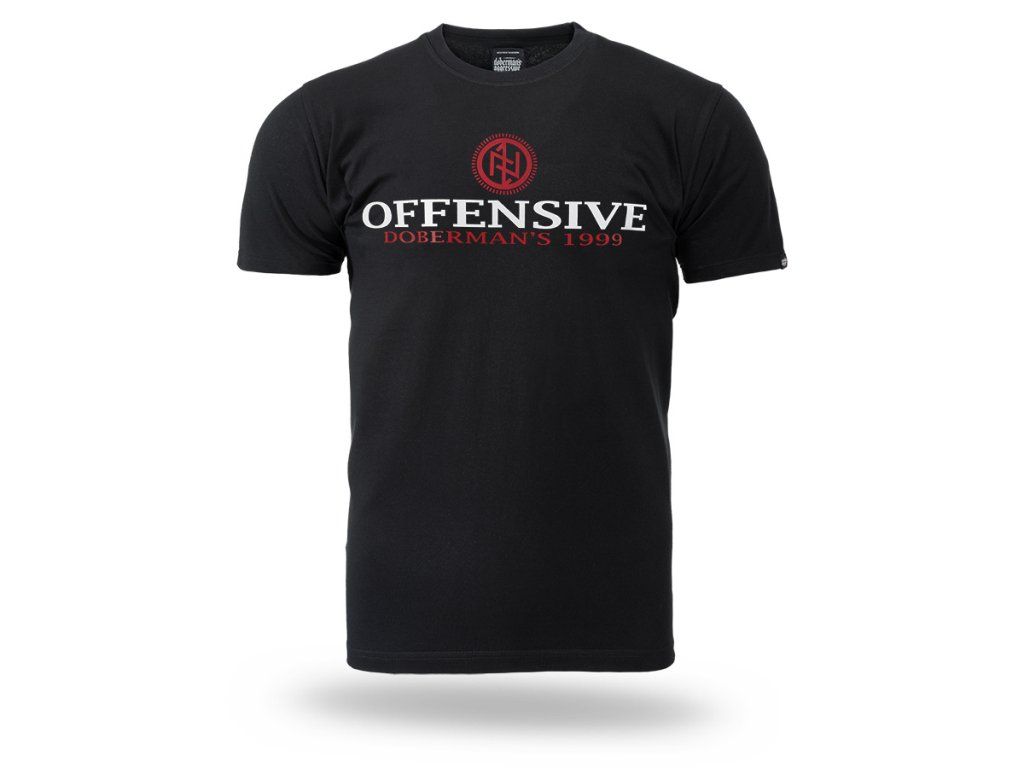 Model s kulatým výstřihem zakončeným žebrovaným lemem a krátkými rukávy, který zajišťuje pohodlí při každodenním nošení. Na přední straně se nachází výrazný potisk s velkým nápisem „OFFENSIVE“, doplněný sloganem „Doberman’s 1999“ a charakteristickým symbolem značky umístěným nad typografií. Zadní strana trička je hladká, což podtrhuje minimalistický charakter střihu a zvýrazňuje výrazný sportovně-streetový akcent na přední straně.