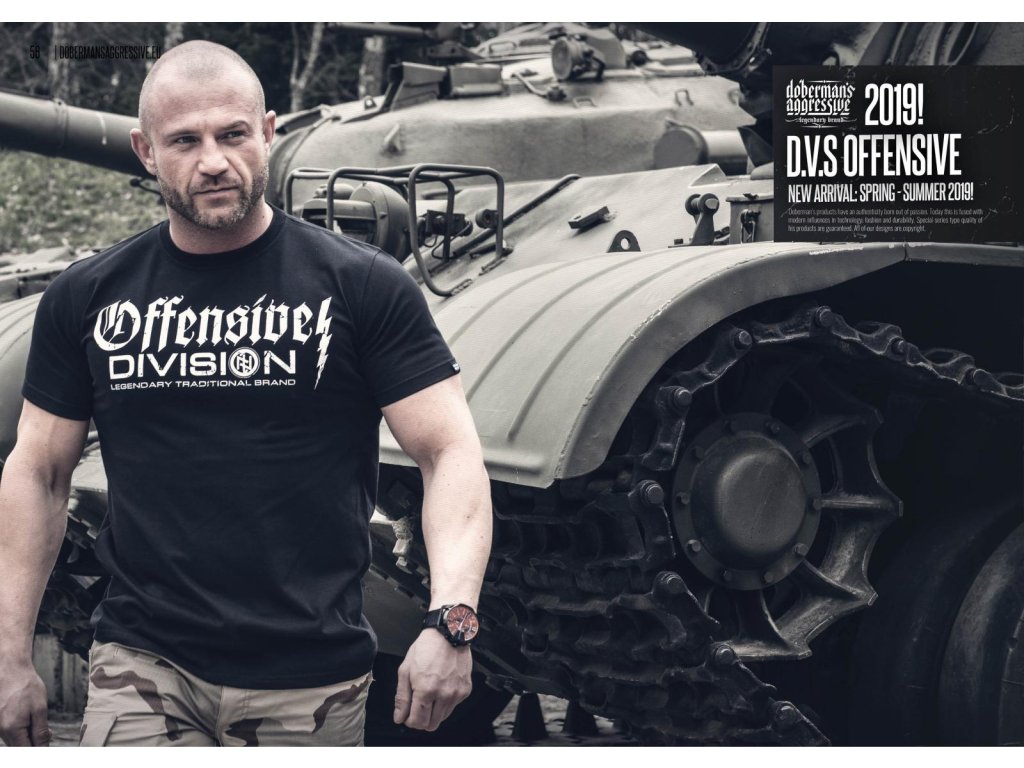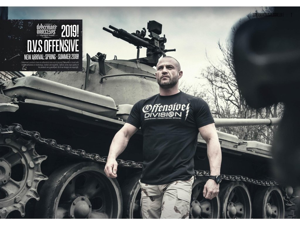 Úzký stahovací lem u krku zlepšuje pohodlí nošení. Tričko je označené cedulkami Dobermans Aggressive. Na hrudi se nachází klasický vzor z řady Offensive. Vzor se skládá ze dvou nápisů. Vedle se nachází blesk. Na zadní straně trička je menší potisk, vzorem je runový znak v kruhu. Použitý efekt poničení potisku.