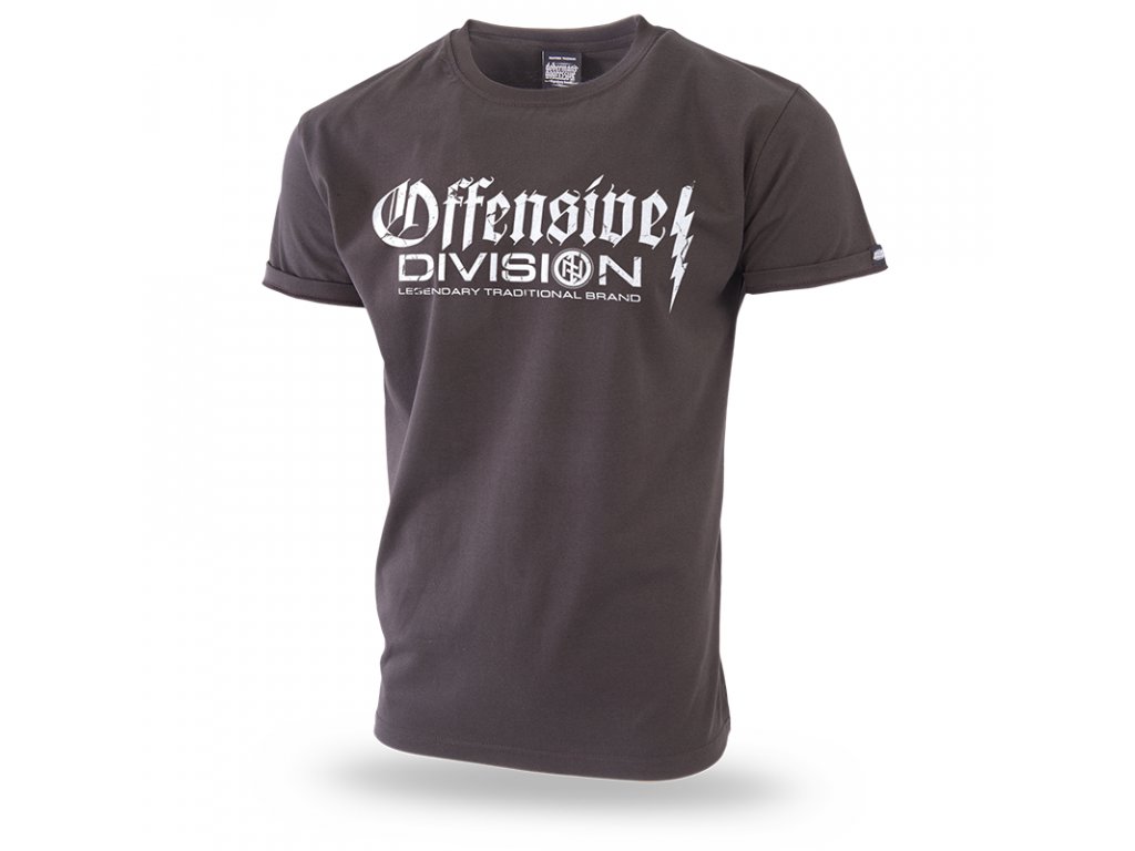 Úzký stahovací lem u krku zlepšuje pohodlí nošení. Tričko je označené cedulkami Dobermans Aggressive. Na hrudi se nachází klasický vzor z řady Offensive. Vzor se skládá ze dvou nápisů. Vedle se nachází blesk. Na zadní straně trička je menší potisk, vzorem je runový znak v kruhu. Použitý efekt poničení potisku.