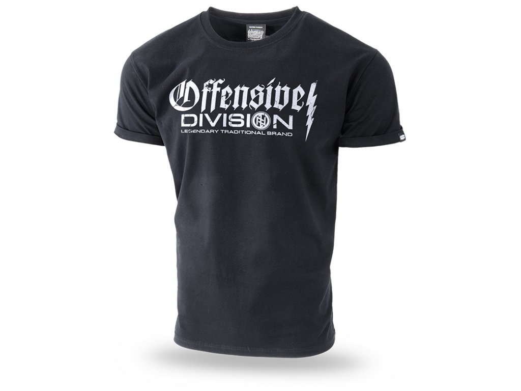 Úzký stahovací lem u krku zlepšuje pohodlí nošení. Tričko je označené cedulkami Dobermans Aggressive. Na hrudi se nachází klasický vzor z řady Offensive. Vzor se skládá ze dvou nápisů. Vedle se nachází blesk. Na zadní straně trička je menší potisk, vzorem je runový znak v kruhu. Použitý efekt poničení potisku.
