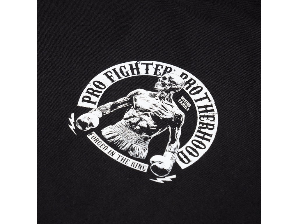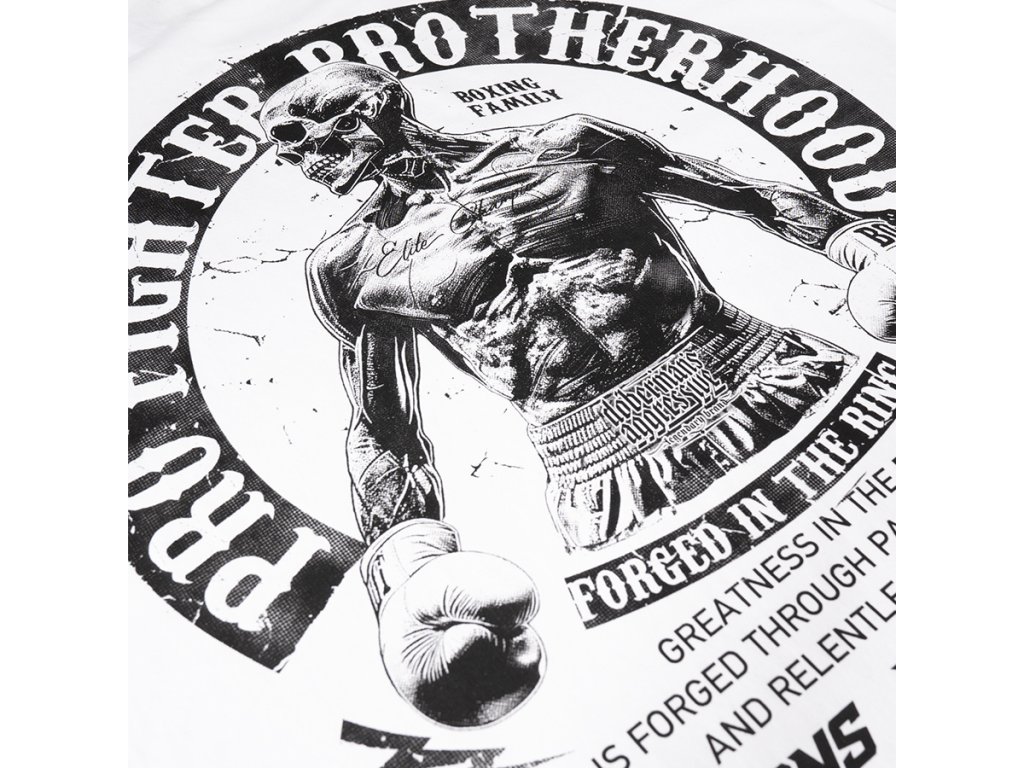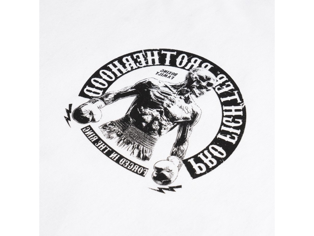 Model je vyroben v pohodlném klasickém střihu s kulatým výstřihem a krátkými rukávy. Na zadní straně se nachází velký potisk s motivem boxera a nápisem „Pro Fighter Brotherhood – Forged in the Ring“, který odkazuje na ducha boje, odhodlání a bratrství ve světě bojových sportů. Na hrudi je umístěno menší logo ve stejném stylu. Tričko je navrženo pro každodenní nošení a kombinuje pohodlí s výrazným stylem inspirovaným boxem. Pečlivě zpracovaný potisk a kvalitní zpracování zdůrazňují charakter a odolnost modelu.