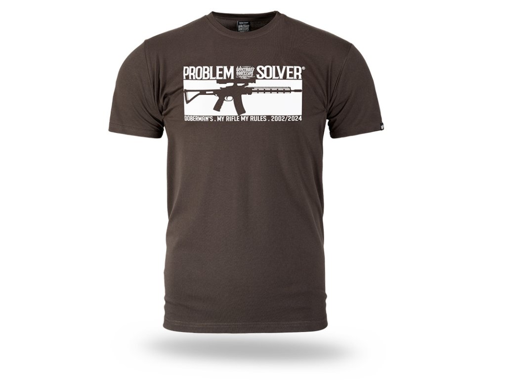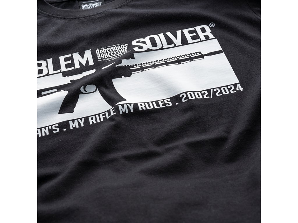 Oblečení je vyrobeno z bavlny o hmotnosti 200g. Na levém rukávu je malá cedulka s logem Doberman’s Aggressive. Na přední straně trička je vzor kulometu, dodatečně nápis PROBLEM SOLVER.