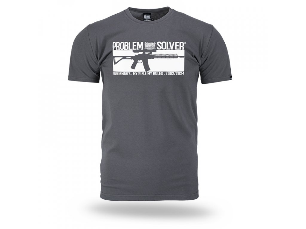 Oblečení je vyrobeno z bavlny o hmotnosti 200g. Na levém rukávu je malá cedulka s logem Doberman’s Aggressive. Na přední straně trička je vzor kulometu, dodatečně nápis PROBLEM SOLVER.