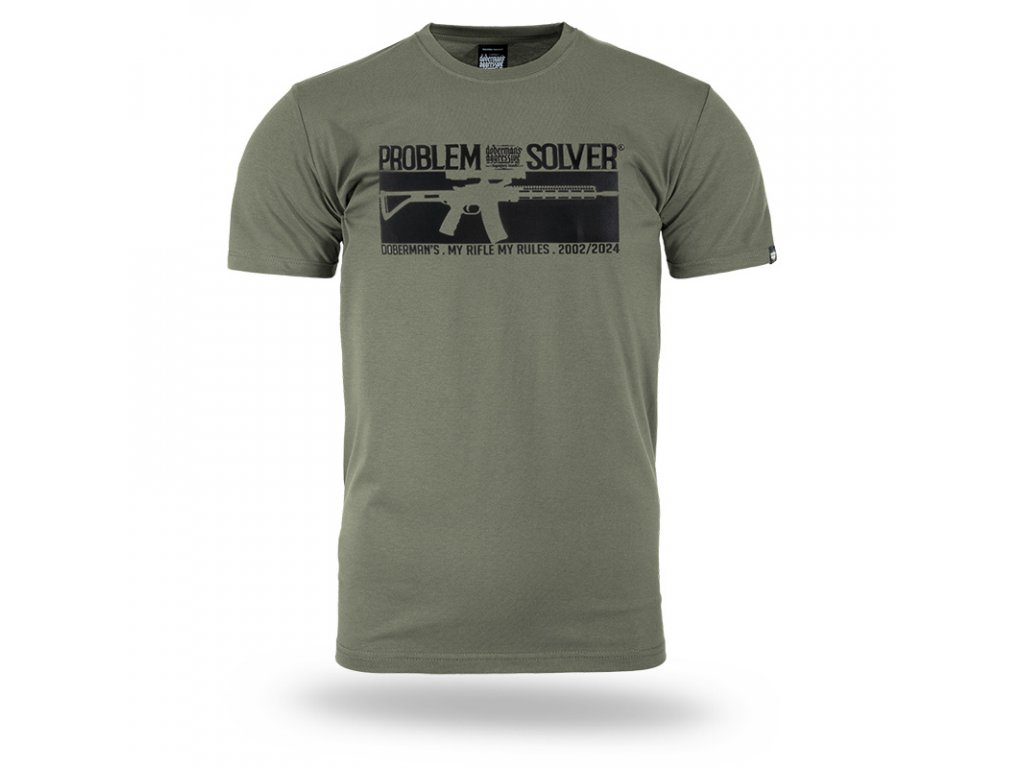 Oblečení je vyrobeno z bavlny o hmotnosti 200g. Na levém rukávu je malá cedulka s logem Doberman’s Aggressive. Na přední straně trička je vzor kulometu, dodatečně nápis PROBLEM SOLVER.