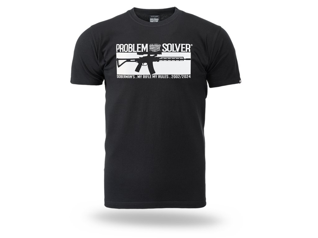 Oblečení je vyrobeno z bavlny o hmotnosti 200g. Na levém rukávu je malá cedulka s logem Doberman’s Aggressive. Na přední straně trička je vzor kulometu, dodatečně nápis PROBLEM SOLVER.