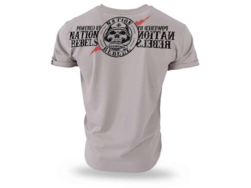 Zadní strana zdobená velkým vzorem s vojenským motivem, který zobrazuje lebku ve vojenské helmě s maltézským křížem a granátem. Kolem nápis Nation Rebell, na lopatkách text Powered By Nation Rebels. Dvoubarevný potisk, s viditelným efektem popraskání. Tričko s krátkým rukávem zakončený stahovacím lemem. Vyrobené z bavlny o vysoké hmotnosti (200g). U krku límeček se třemi knoflíky a zpevnění v podobě vnitřního lemování.