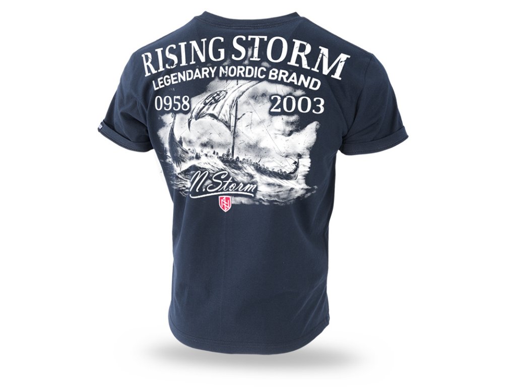 Standardní pánský střih trička s krátkým rukávem. Červené detaily v podobě vnitřního lemování a firemního štítku. U krku je stahovací lem, na hrudi nevelké logo N.Storm. Uprostřed zad je vzor s motivem drakaru plujícího po rozbouřeném moři. Výše nápisy: Rising Storm, Legendary Nordic Brand a čísla 0958 a 2003, níže aplikace v podobě vyšívané nášivky. Výšivka ve dvou barvách.