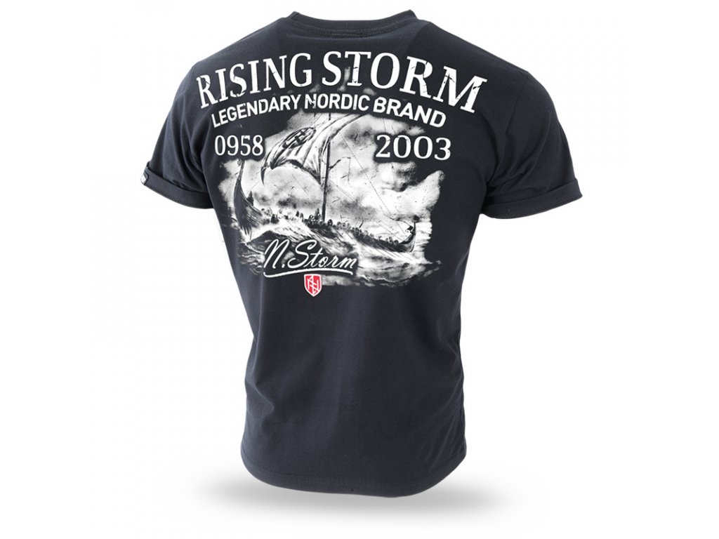 Standardní pánský střih trička s krátkým rukávem. Červené detaily v podobě vnitřního lemování a firemního štítku. U krku je stahovací lem, na hrudi nevelké logo N.Storm. Uprostřed zad je vzor s motivem drakaru plujícího po rozbouřeném moři. Výše nápisy: Rising Storm, Legendary Nordic Brand a čísla 0958 a 2003, níže aplikace v podobě vyšívané nášivky. Výšivka ve dvou barvách.