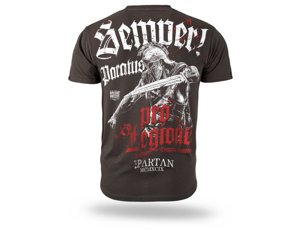 Model je vyroben v pohodlném klasickém střihu s kulatým výstřihem. Na zadní straně se nachází velký dynamický potisk zobrazující bojovníka v helmě s mečem spolu s nápisy „Semper Paratus“ a „Pro Legione“, které odkazují na vojenskou symboliku a ducha připravenosti k akci. Na přední straně je umístěn malý potisk na úrovni hrudi. Tričko je navrženo pro každodenní nošení a spojuje pohodlí s výrazným stylem charakteristickým pro značku Doberman’s Aggressive.