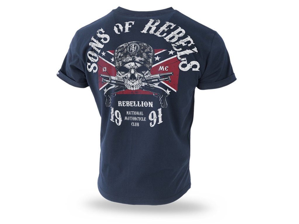 Pod krkem zakončené stahovacím lemem. Na levé straně, na hrudi vytištěné číslo 13 a ozdobné nápisy pod ním. Na zadní straně trička je velký potisk ve dvou barvách, který zobrazuje lebku a dvě zkřížené brokovnice, na pozadí konfederační vlajky. Nad vzorem je nápis Sons of Rebels a jiné související se značkou. Na levém rukávu trička je tkaná cedulka s logem.