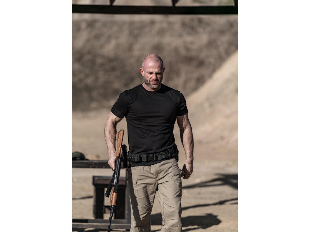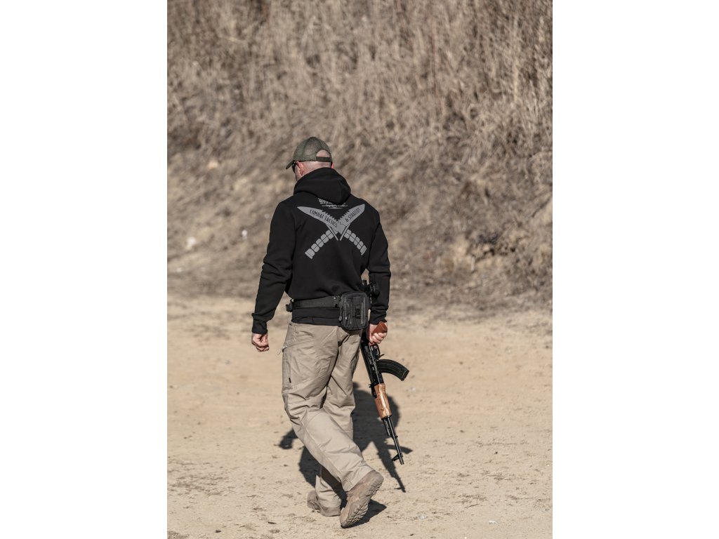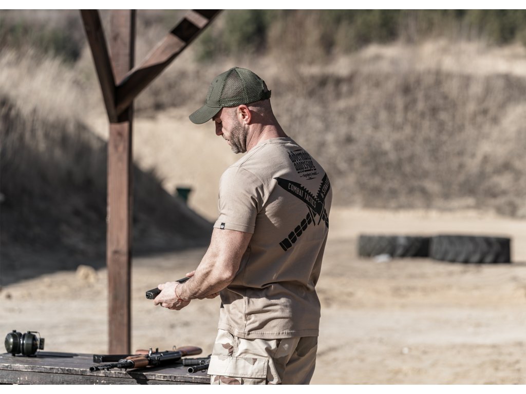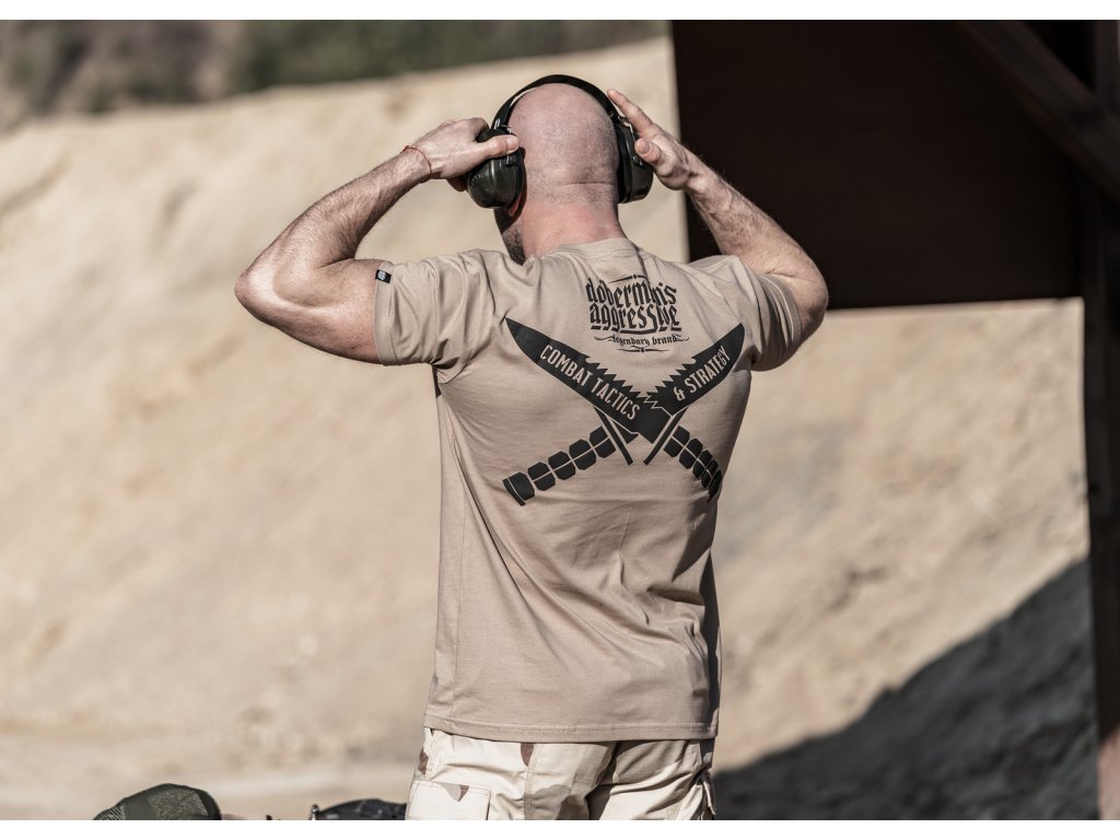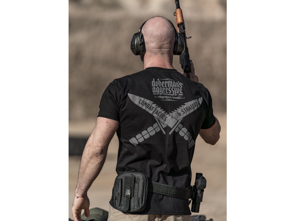 Vyrobeno z vysoce kvalitní bavlny, zajišťující pohodlí při nošení. Na zadní straně velký 3D puffy potisk zobrazující zkřížené taktické nože s čepelemi směřujícími vzhůru a nápis "COMBAT TACTICS & STRATEGY". Nad grafikou logo značky "DOBERMANS AGGRESSIVE". Přední strana trička je hladká, bez potisku.