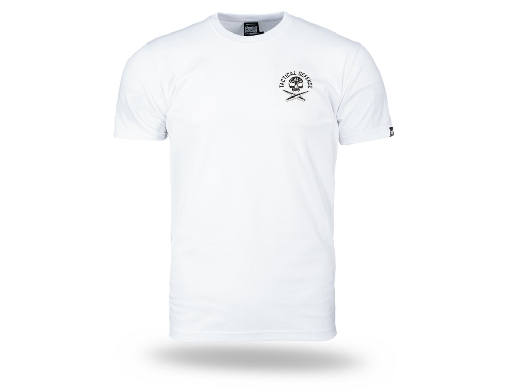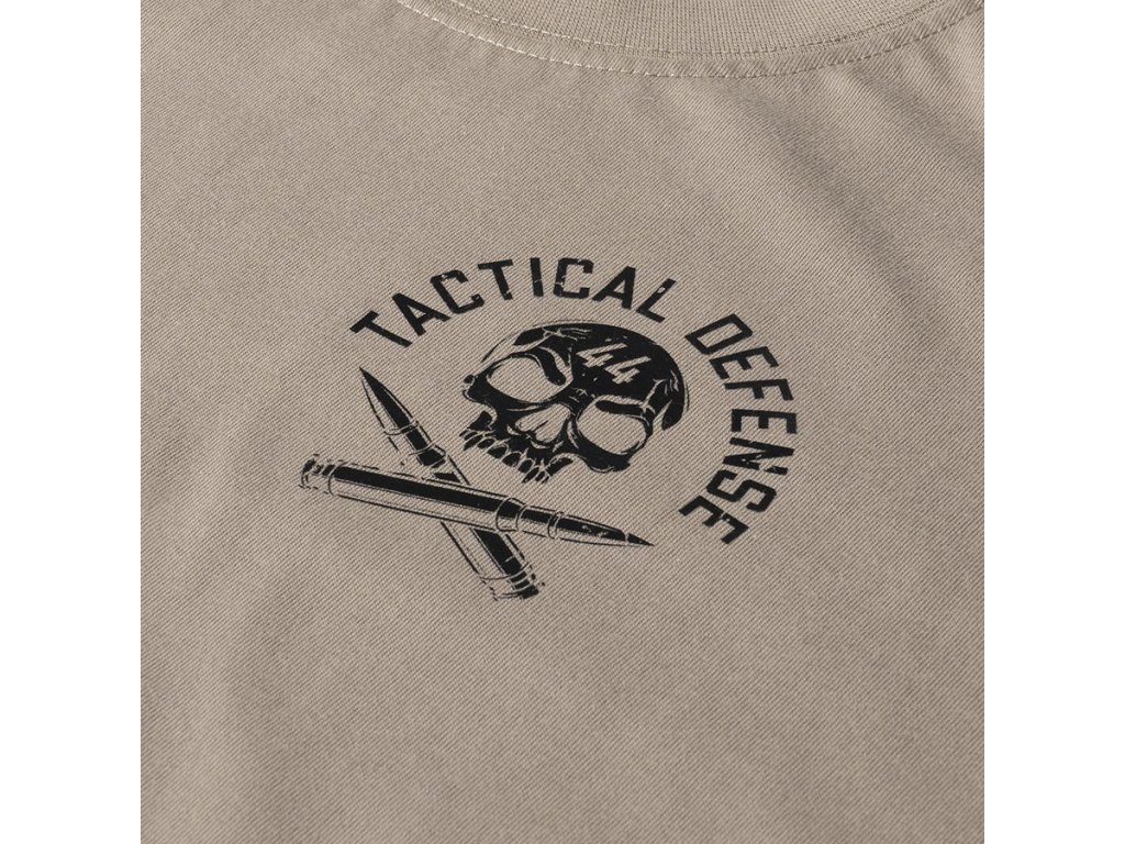 Model je vyroben z kvalitní bavlny, která zajišťuje pohodlí při nošení a dobrou prodyšnost. Na přední straně se nachází decentní potisk s motivem lebky a zkřížených zbraní a nápisem „Tactical Defense“. Zadní část zaujme výraznou, dynamickou grafikou s motivem pušky, technickými prvky a vertikálním nápisem „Tactical Defense – Military Series – Defend Your Land“. Celkový vzhled je laděn do vojenského, výrazného stylu pro ty, kteří preferují odvážný design a silný charakter.