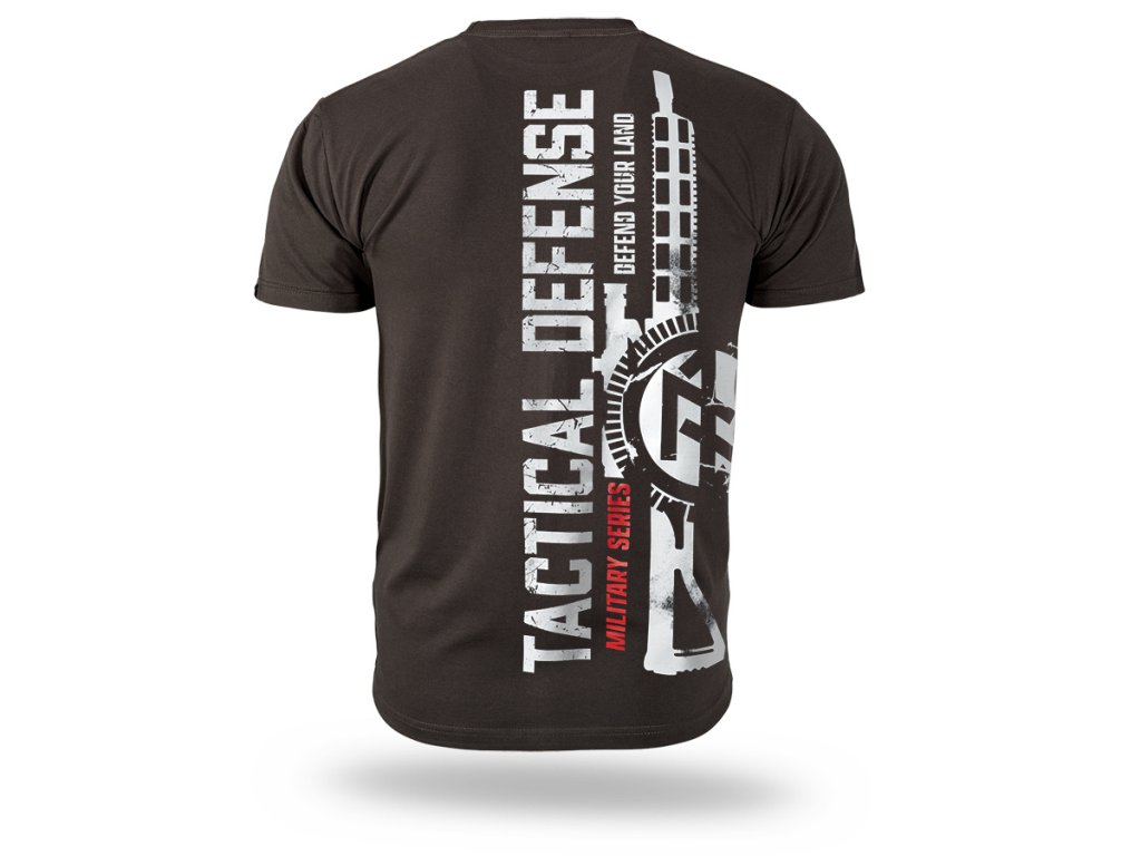 Model je vyroben z kvalitní bavlny, která zajišťuje pohodlí při nošení a dobrou prodyšnost. Na přední straně se nachází decentní potisk s motivem lebky a zkřížených zbraní a nápisem „Tactical Defense“. Zadní část zaujme výraznou, dynamickou grafikou s motivem pušky, technickými prvky a vertikálním nápisem „Tactical Defense – Military Series – Defend Your Land“. Celkový vzhled je laděn do vojenského, výrazného stylu pro ty, kteří preferují odvážný design a silný charakter.