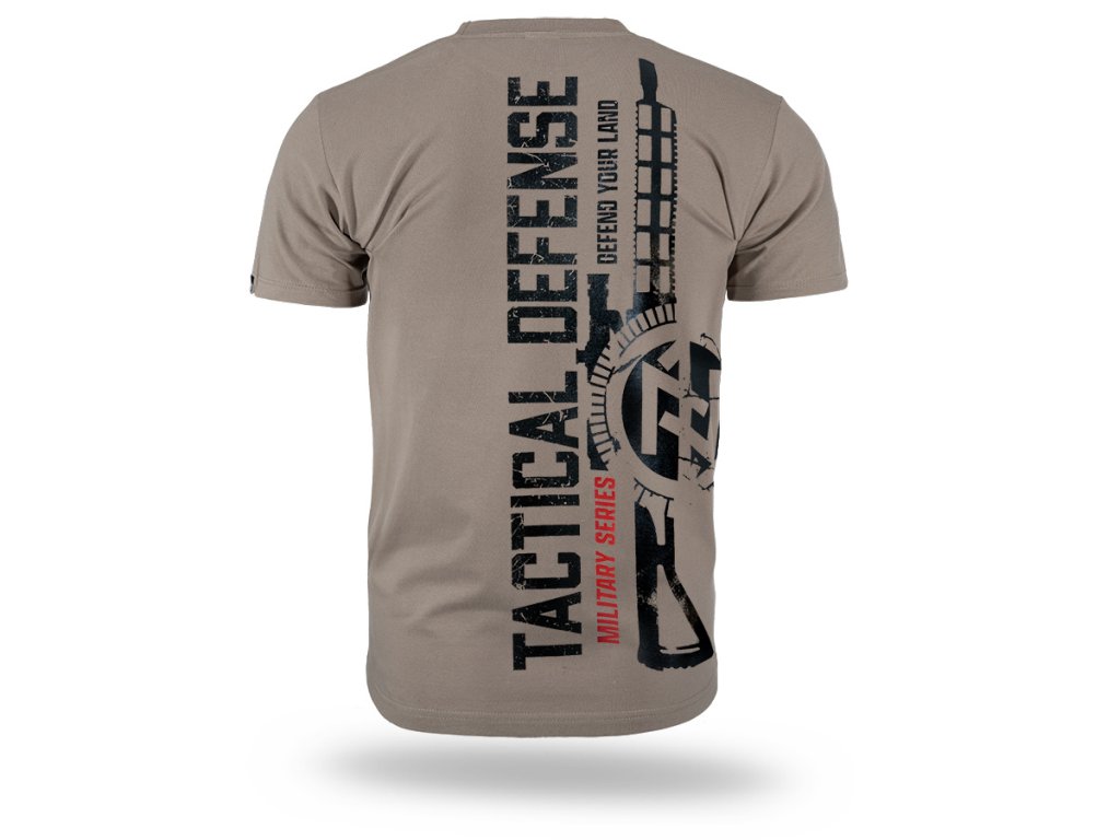 Model je vyroben z kvalitní bavlny, která zajišťuje pohodlí při nošení a dobrou prodyšnost. Na přední straně se nachází decentní potisk s motivem lebky a zkřížených zbraní a nápisem „Tactical Defense“. Zadní část zaujme výraznou, dynamickou grafikou s motivem pušky, technickými prvky a vertikálním nápisem „Tactical Defense – Military Series – Defend Your Land“. Celkový vzhled je laděn do vojenského, výrazného stylu pro ty, kteří preferují odvážný design a silný charakter.