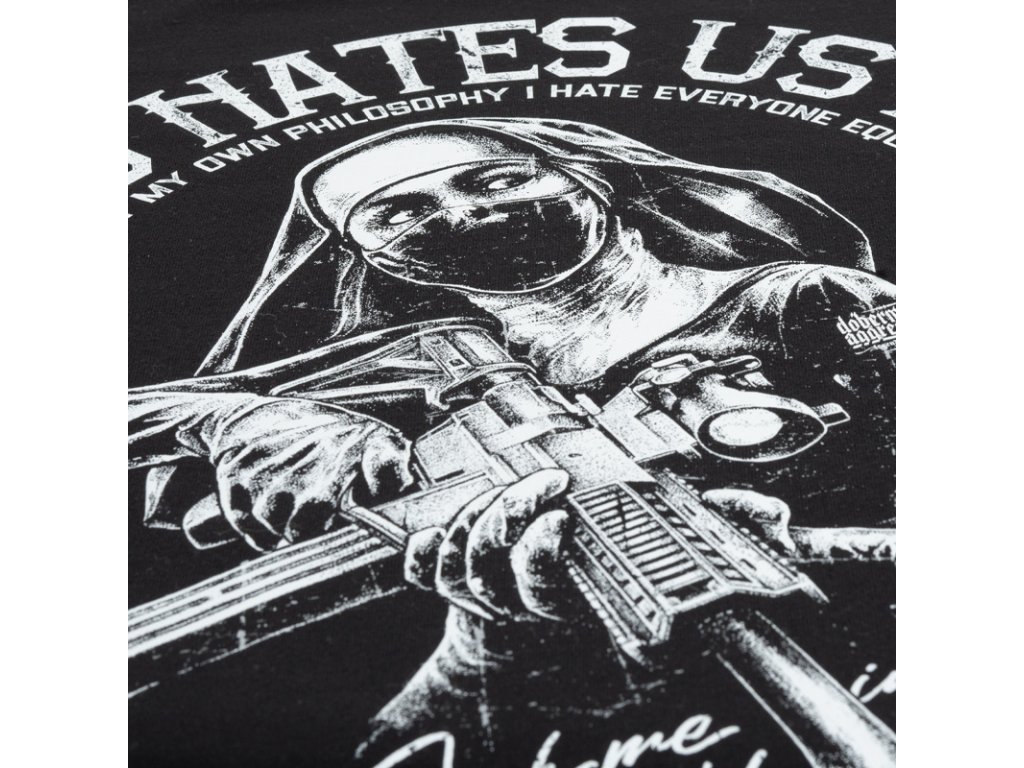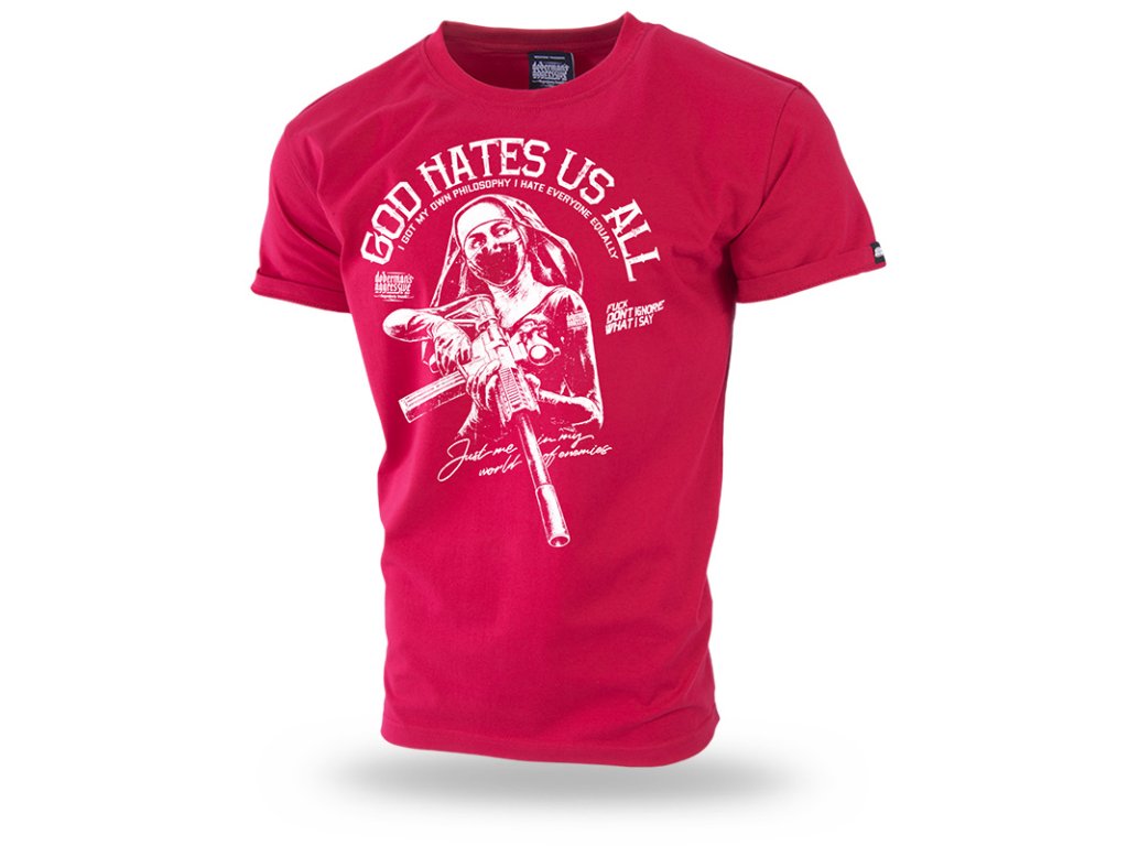 Vyrobeno z vysoce kvalitní bavlny. Model The Nun je vytvořený pro vyvolené. Tričko s velkým potiskem postavy jeptišky se zbraní a nápisem GOD HATES US ALL a s logem značky Doberman’s Aggressive.