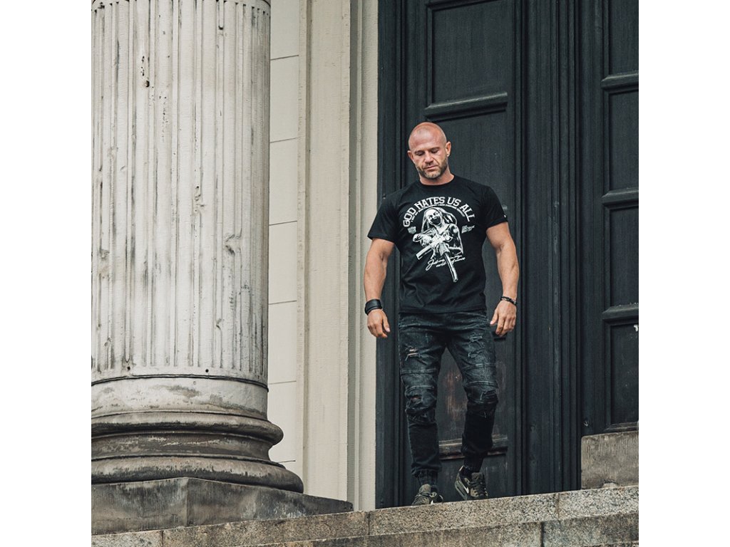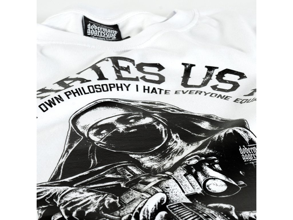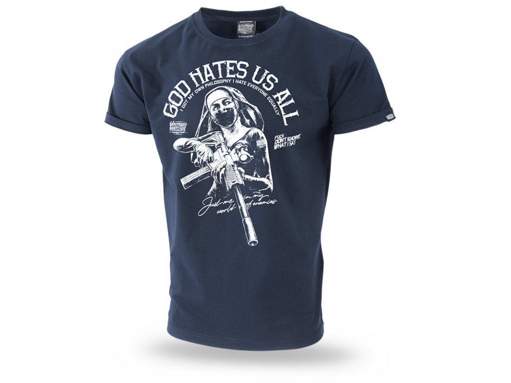 Vyrobeno z vysoce kvalitní bavlny. Model The Nun je vytvořený pro vyvolené. Tričko s velkým potiskem postavy jeptišky se zbraní a nápisem GOD HATES US ALL a s logem značky Doberman’s Aggressive.