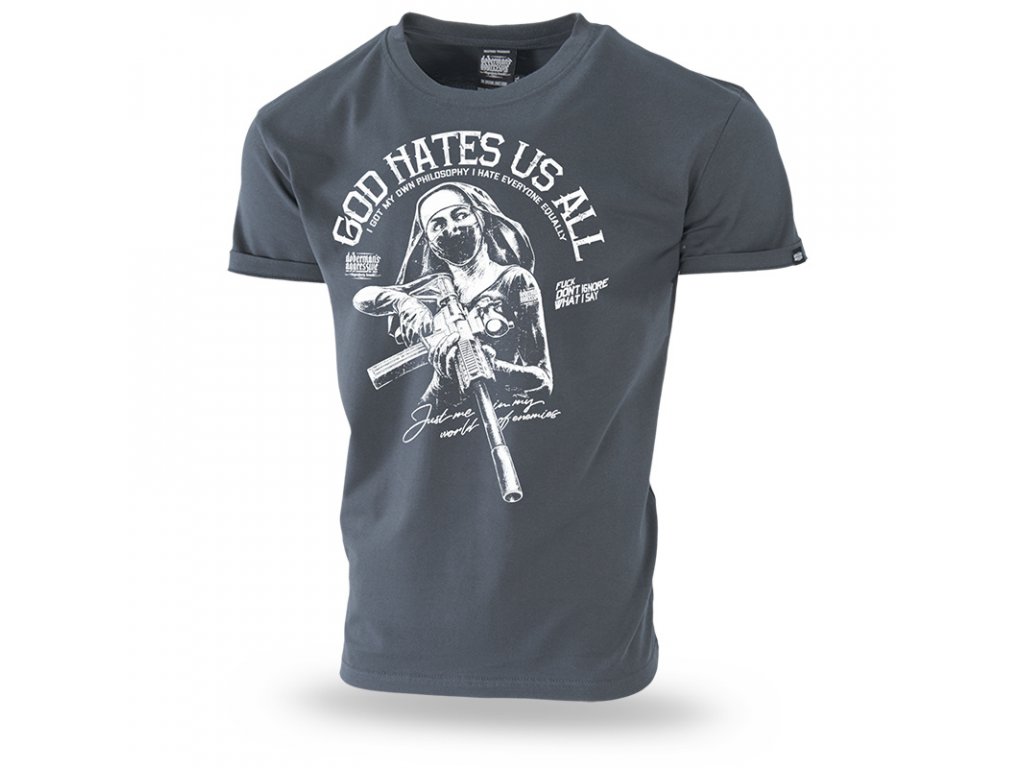 Vyrobeno z vysoce kvalitní bavlny. Model The Nun je vytvořený pro vyvolené. Tričko s velkým potiskem postavy jeptišky se zbraní a nápisem GOD HATES US ALL a s logem značky Doberman’s Aggressive.