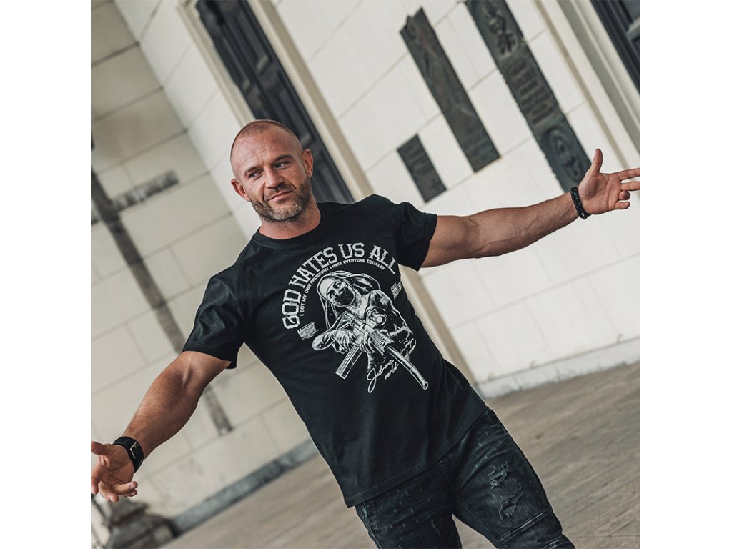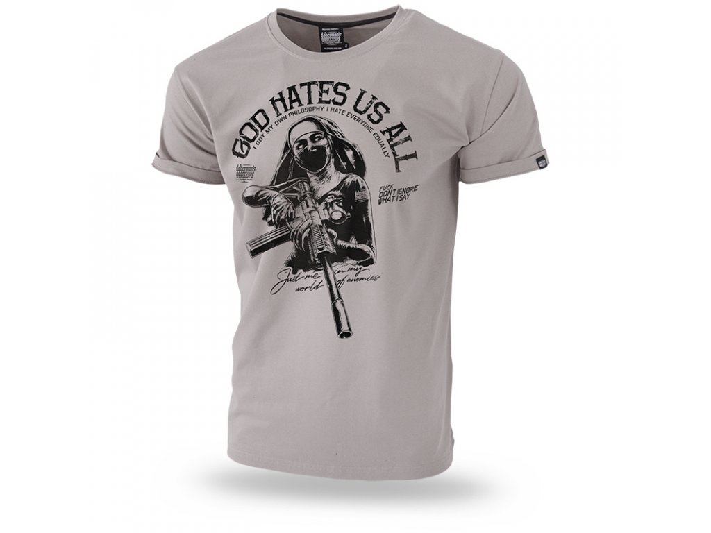 Vyrobeno z vysoce kvalitní bavlny. Model The Nun je vytvořený pro vyvolené. Tričko s velkým potiskem postavy jeptišky se zbraní a nápisem GOD HATES US ALL a s logem značky Doberman’s Aggressive.