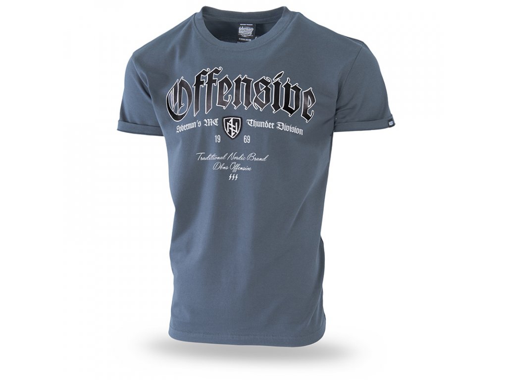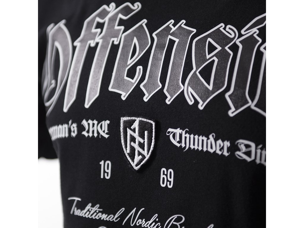 Bavlněné tričko vysoké kvality z kolekce OFFENSIVE. Na hrudi je velký nápis Offensive v gotickém stylu. Níže uprostřed je nášivka s vyšitým štítem s runami, která navazuje na severské náboženství. Po stranách jsou nápisy ve stejném stylu. Níže je heslo a tři blesky. Na krku se opakuje motiv blesků, jenomže vyšívaný, což vytváří charakter celku. Tričko má na rukávu malou cedulku s našim logem.