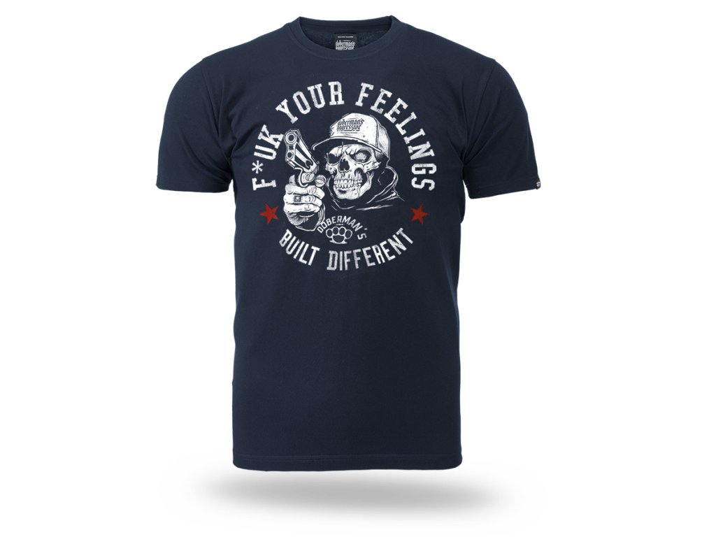 Model je vyroben v pohodlném klasickém střihu s kulatým výstřihem zakončeným elastickým nápletem. Na přední straně se nachází výrazný potisk zobrazující lebku v kšiltovce držící zbraň, obklopenou nápisem „F*ck Your Feelings – Built Different“ a grafickými prvky charakteristickými pro značku Doberman’s Aggressive. Dynamický design zdůrazňuje rebelský a nekompromisní charakter inspirovaný streetovou kulturou. Tričko poskytuje pohodlí při nošení a skvěle se hodí jako součást výrazného každodenního outfitu.