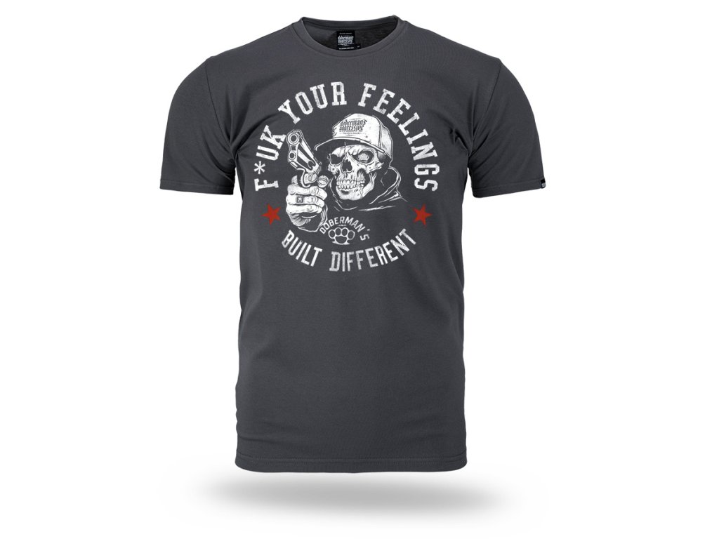 Model je vyroben v pohodlném klasickém střihu s kulatým výstřihem zakončeným elastickým nápletem. Na přední straně se nachází výrazný potisk zobrazující lebku v kšiltovce držící zbraň, obklopenou nápisem „F*ck Your Feelings – Built Different“ a grafickými prvky charakteristickými pro značku Doberman’s Aggressive. Dynamický design zdůrazňuje rebelský a nekompromisní charakter inspirovaný streetovou kulturou. Tričko poskytuje pohodlí při nošení a skvěle se hodí jako součást výrazného každodenního outfitu.