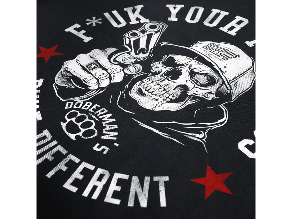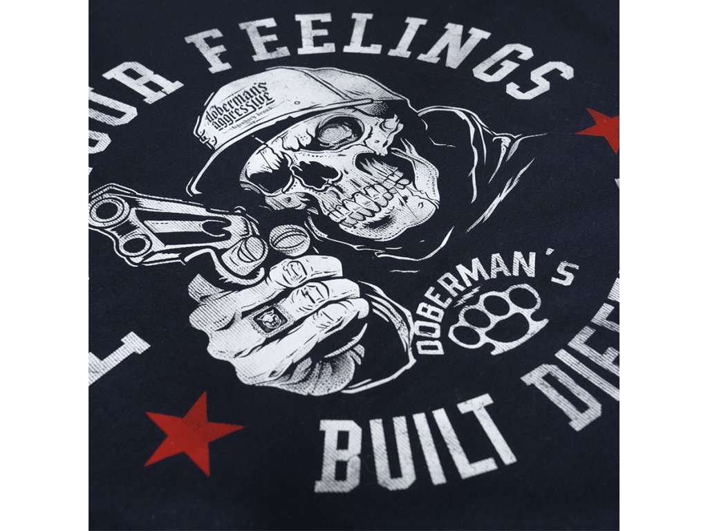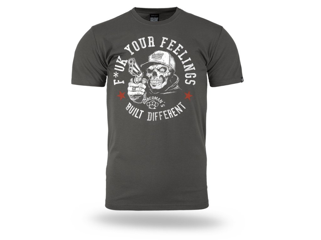 Model je vyroben v pohodlném klasickém střihu s kulatým výstřihem zakončeným elastickým nápletem. Na přední straně se nachází výrazný potisk zobrazující lebku v kšiltovce držící zbraň, obklopenou nápisem „F*ck Your Feelings – Built Different“ a grafickými prvky charakteristickými pro značku Doberman’s Aggressive. Dynamický design zdůrazňuje rebelský a nekompromisní charakter inspirovaný streetovou kulturou. Tričko poskytuje pohodlí při nošení a skvěle se hodí jako součást výrazného každodenního outfitu.