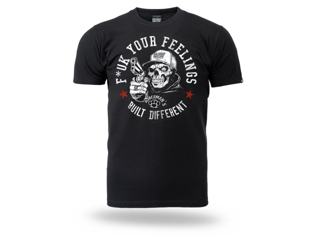 Model je vyroben v pohodlném klasickém střihu s kulatým výstřihem zakončeným elastickým nápletem. Na přední straně se nachází výrazný potisk zobrazující lebku v kšiltovce držící zbraň, obklopenou nápisem „F*ck Your Feelings – Built Different“ a grafickými prvky charakteristickými pro značku Doberman’s Aggressive. Dynamický design zdůrazňuje rebelský a nekompromisní charakter inspirovaný streetovou kulturou. Tričko poskytuje pohodlí při nošení a skvěle se hodí jako součást výrazného každodenního outfitu.