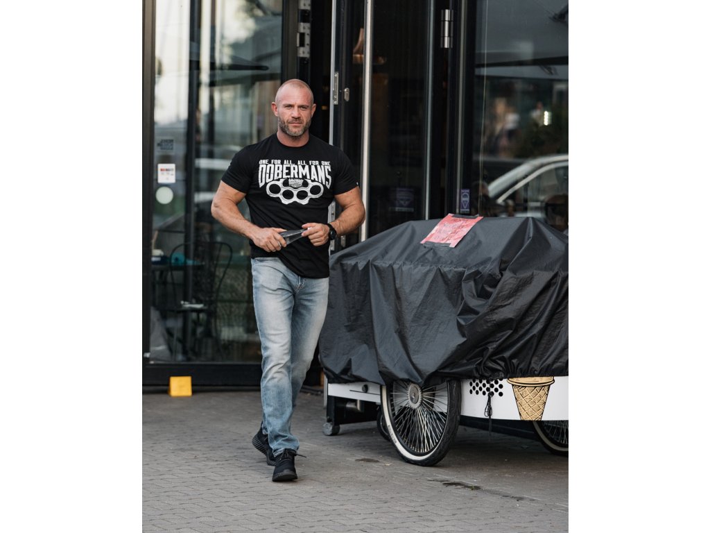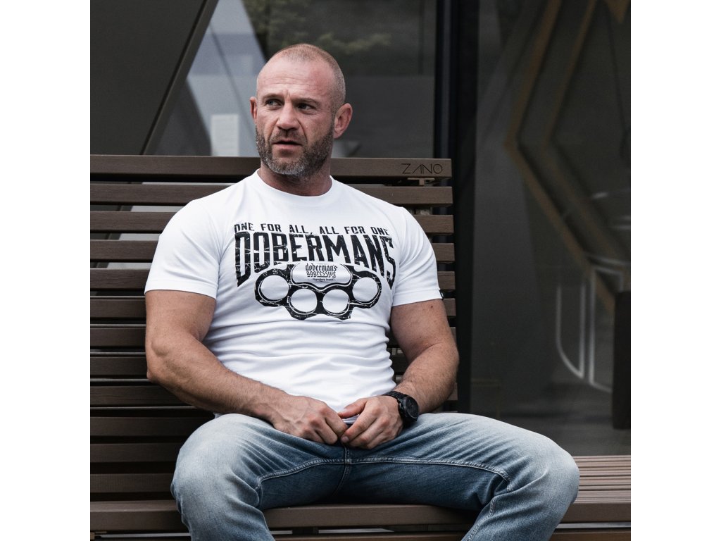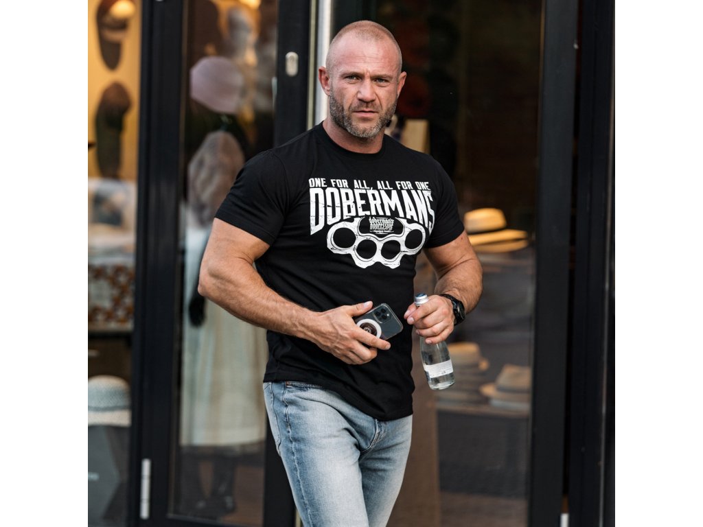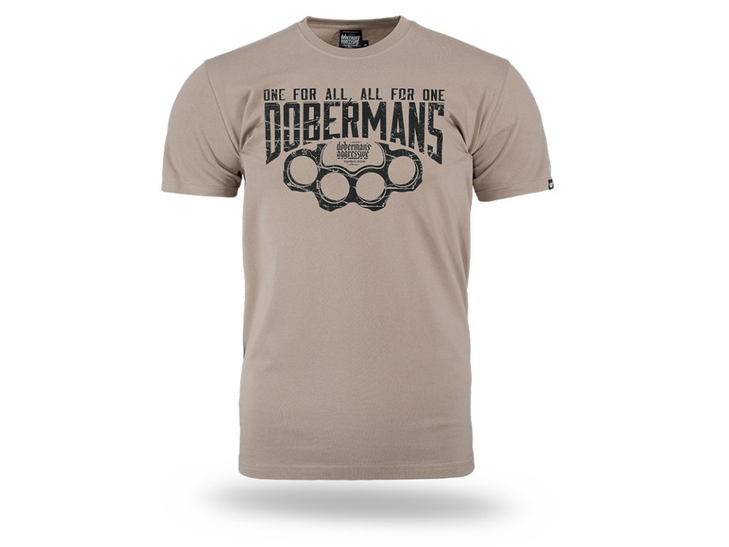 Oblečení je vyrobeno z bavlny o hmotnosti 200g. Na levém rukávu je malá cedulka s logem Doberman’s Aggressive. Na přední straně trička je velký nápis DOBERMANS s nápisem One For All, All For one. Celek je zakončený vzorem boxeru a logem značky.