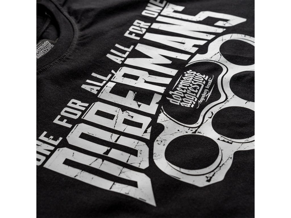 Oblečení je vyrobeno z bavlny o hmotnosti 200g. Na levém rukávu je malá cedulka s logem Doberman’s Aggressive. Na přední straně trička je velký nápis DOBERMANS s nápisem One For All, All For one. Celek je zakončený vzorem boxeru a logem značky.
