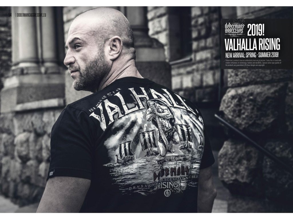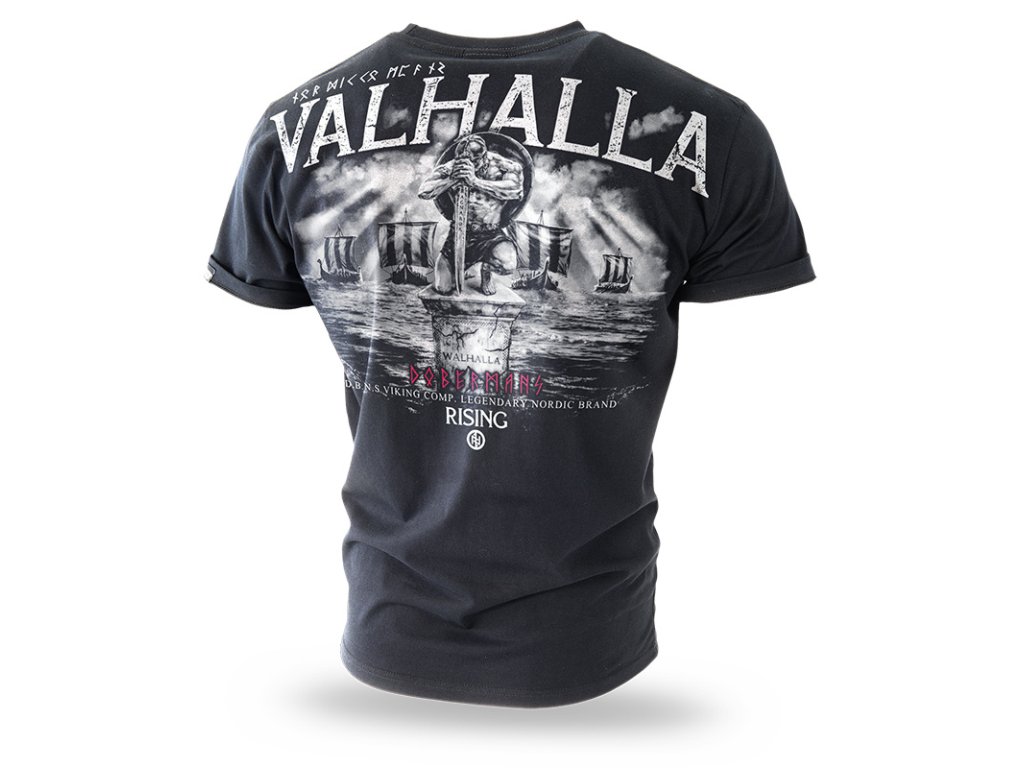 Tričko je u krku zakončené úzkým stahovacím lemem, který zvyšuje pohodlí nošení. Na levé straně hrudi je nevelký nápis Valhalla a runový symbol. Záda jsou do značné míry pokrytá potiskem. Vzor zobrazuje majestátního bojovníka na podstavci. Naklání se a opírá o meč. Za ním je viditelná vikingská flotila. Výše se nachází velký nápis Valhalla a runové symboly. Vzor navazuje na řadu Vikings.