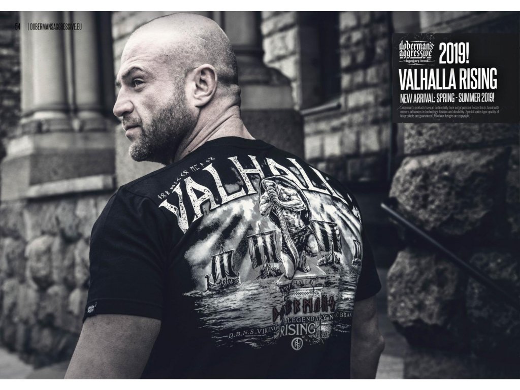 Tričko je u krku zakončené úzkým stahovacím lemem, který zvyšuje pohodlí nošení. Na levé straně hrudi je nevelký nápis Valhalla a runový symbol. Záda jsou do značné míry pokrytá potiskem. Vzor zobrazuje majestátního bojovníka na podstavci. Naklání se a opírá o meč. Za ním je viditelná vikingská flotila. Výše se nachází velký nápis Valhalla a runové symboly. Vzor navazuje na řadu Vikings.