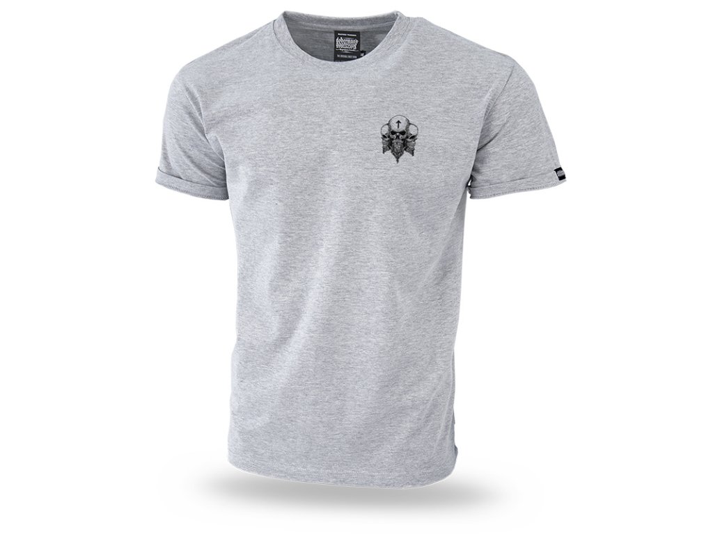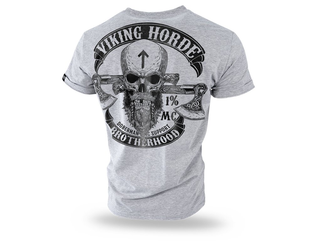Úzký stahovací lem u krku zlepšuje pohodlí nošení. Na levém rukávu je tkaná cedulka s logem Dobermans Aggressive. Záda trička jsou zdobená velkým potiskem s lebkou Vikinga. Za ní se nachází dvě sekery. Na praporech jsou nápisy - Viking Horde a Brotherhood. Na levé straně hrudi jsou menší lebky s runovými symboly. Celek navazuje na severskou mytologii. Potisk v jedné barvě.