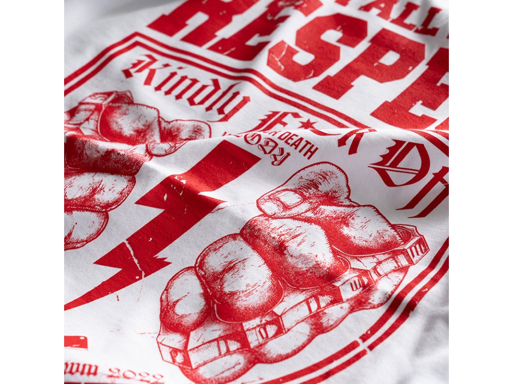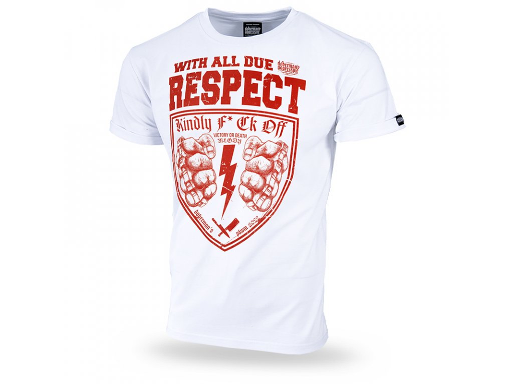 Oblečení je vyrobeno z bavlny o hmotnosti 200g. Na levém rukávu je malá cedulka s logem Doberman’s Aggressive. Na přední straně trička se nachází velký nápis WITH ALL DUE RESPECT, níže sevřené pěsti s boxerem rozdělené bleskem, nad nimi nápis Kindly F*ck Off - celek je uzavřený ve tvaru štítu.