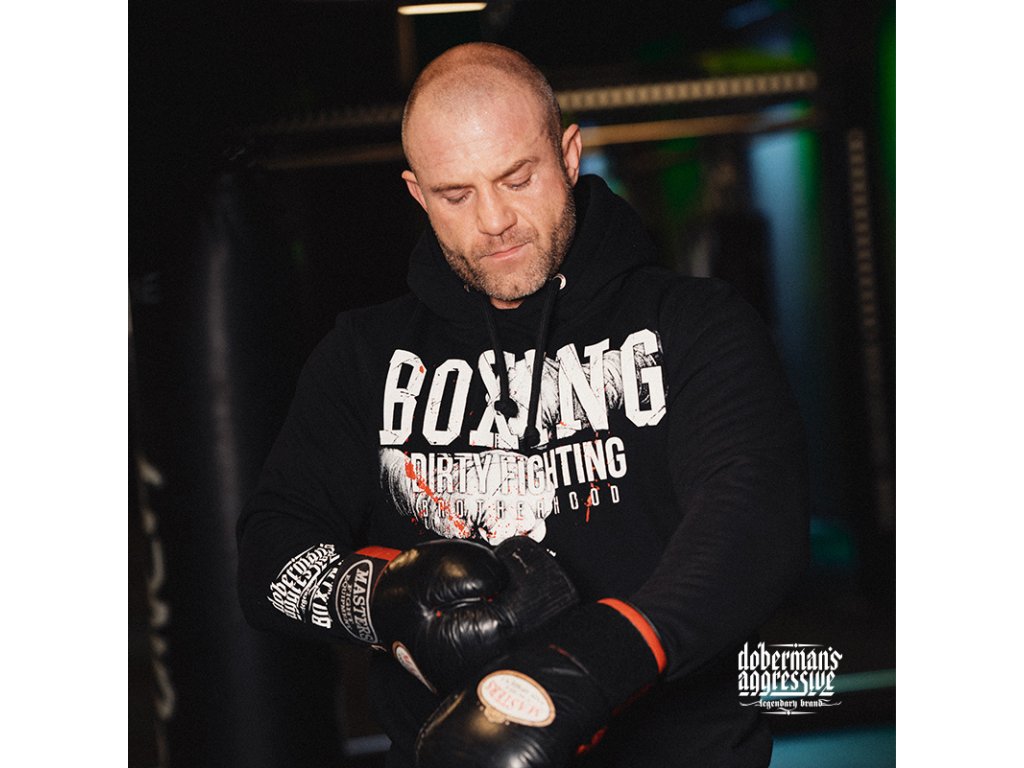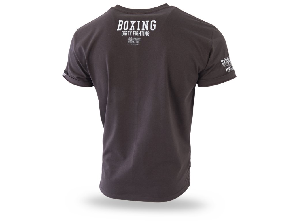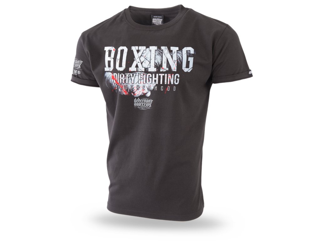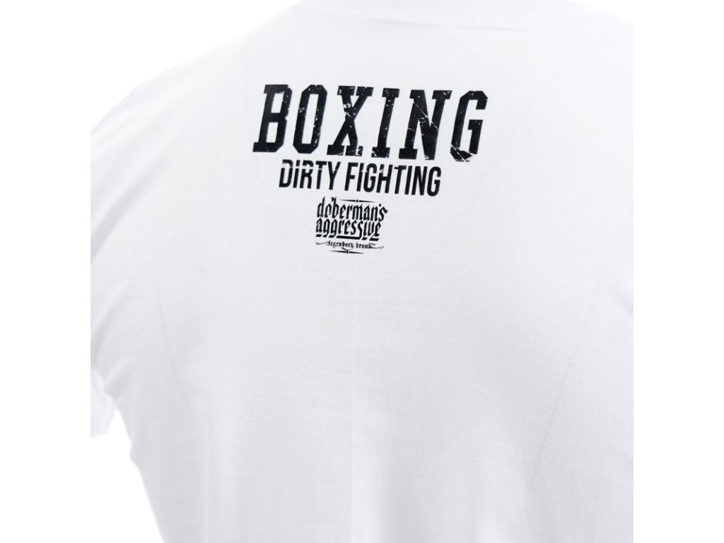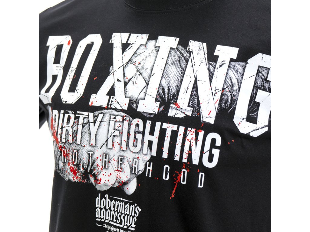 Na pravém rukávu je potisk s logem značky a nápisem BOXING DIRTY FIGHTING. Levý rukáv s našitou malou cedulkou Doberman’s Aggressive. Na přední straně je nápis BOXING DIRTY FIGHTING a logo značky na pozadí sevřných boxerských pěstí. Zadní strana je bez nápisu, na krku miniatura vzoru, který se nachází na přední straně trička.