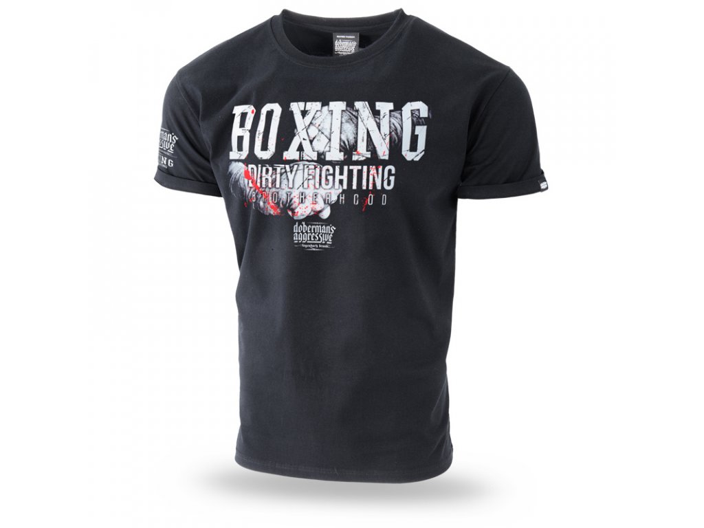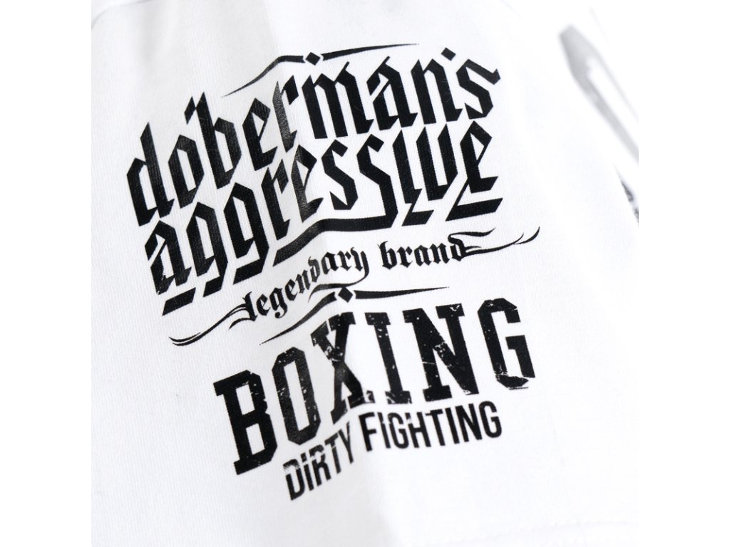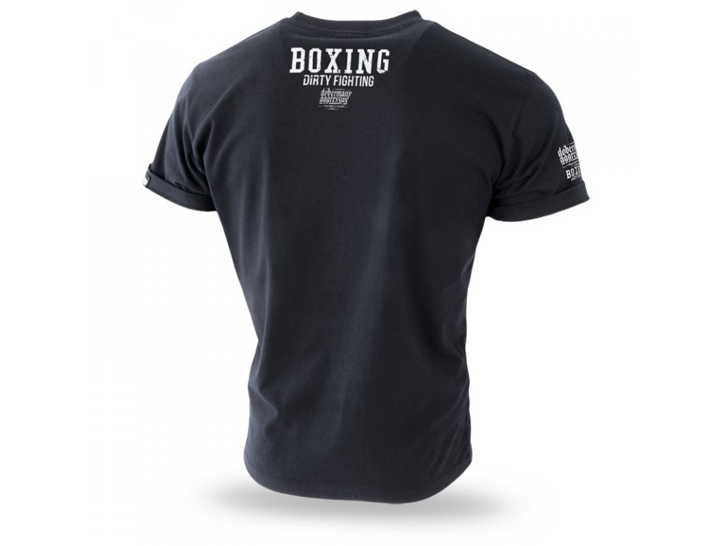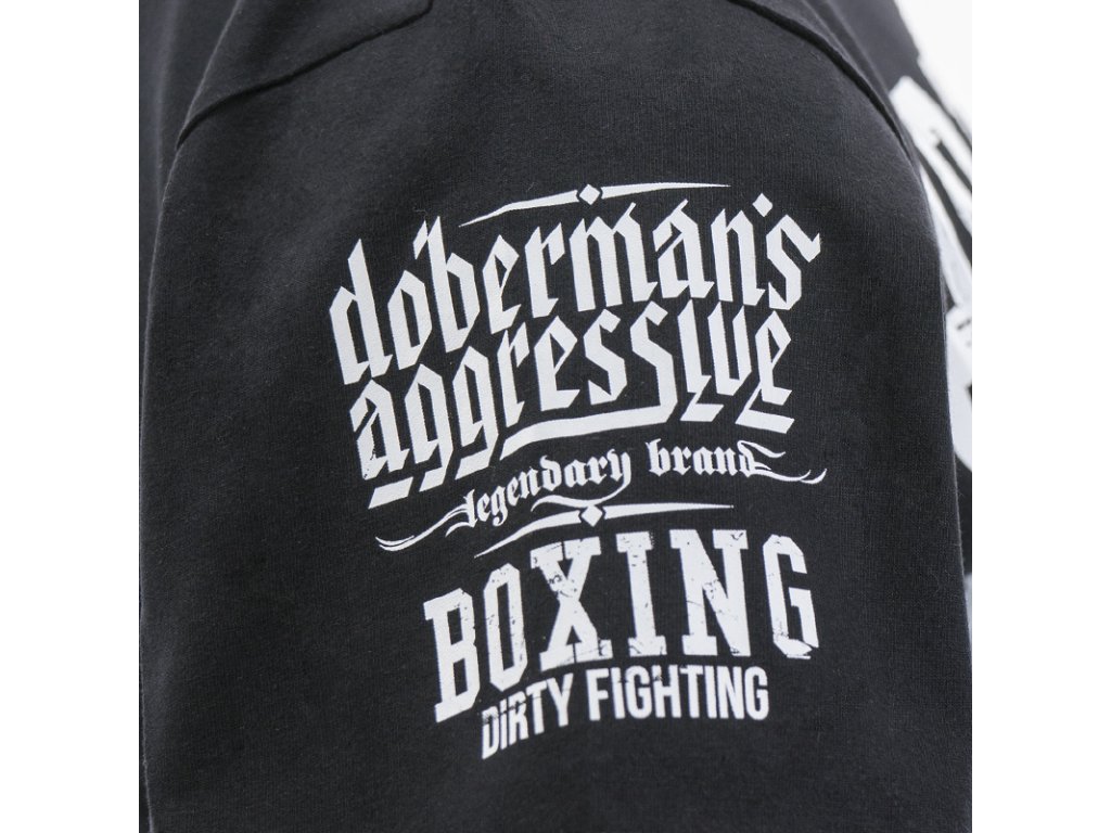 Na pravém rukávu je potisk s logem značky a nápisem BOXING DIRTY FIGHTING. Levý rukáv s našitou malou cedulkou Doberman’s Aggressive. Na přední straně je nápis BOXING DIRTY FIGHTING a logo značky na pozadí sevřných boxerských pěstí. Zadní strana je bez nápisu, na krku miniatura vzoru, který se nachází na přední straně trička.